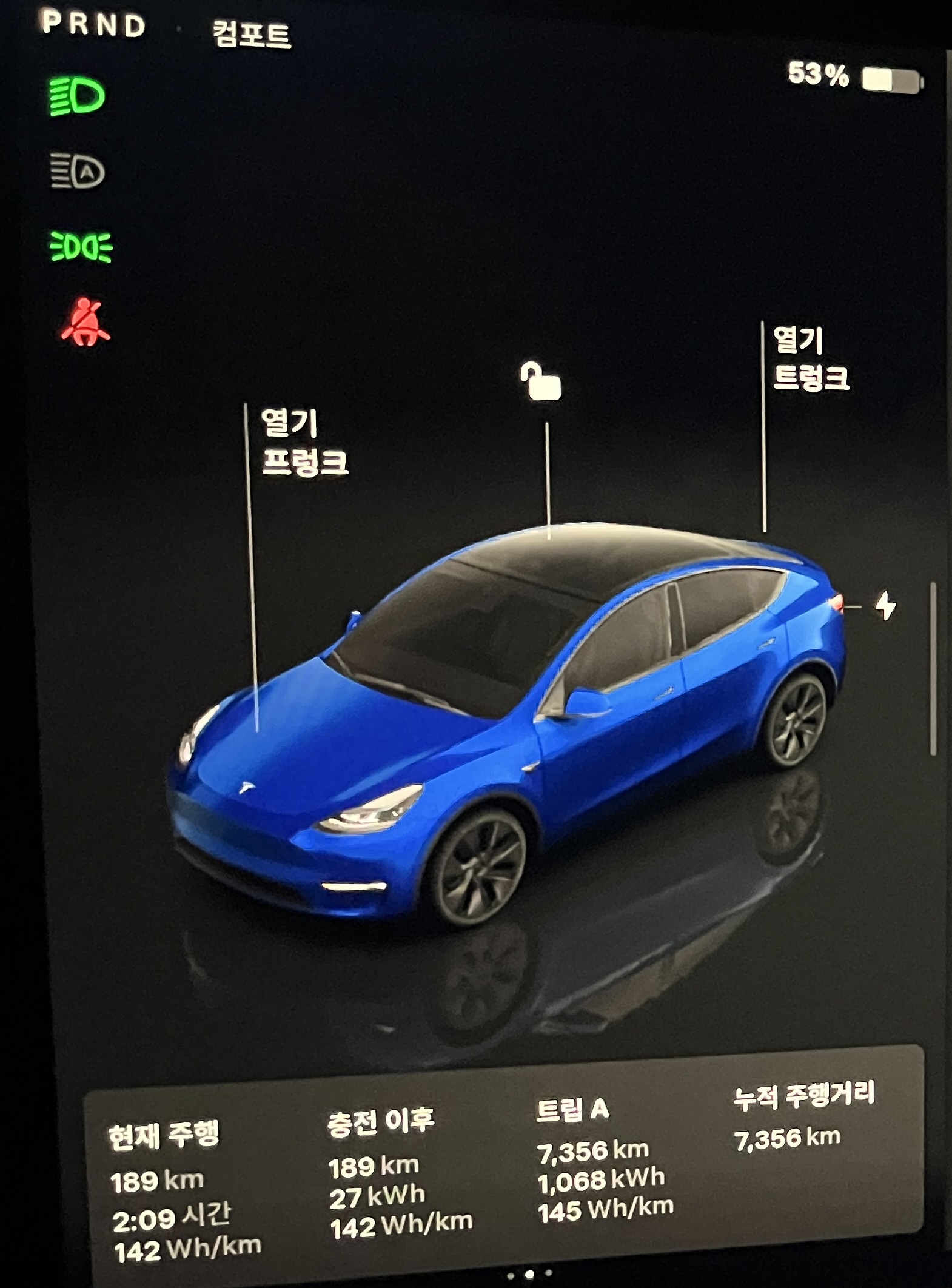 | 배터리 소모 93%(362km)->28%(108km) = 65% 소모 (254km) 충전 이후 실 주행 206km, 2시간 8분 전비 175Wh/km (약 5.71km/kWh) |