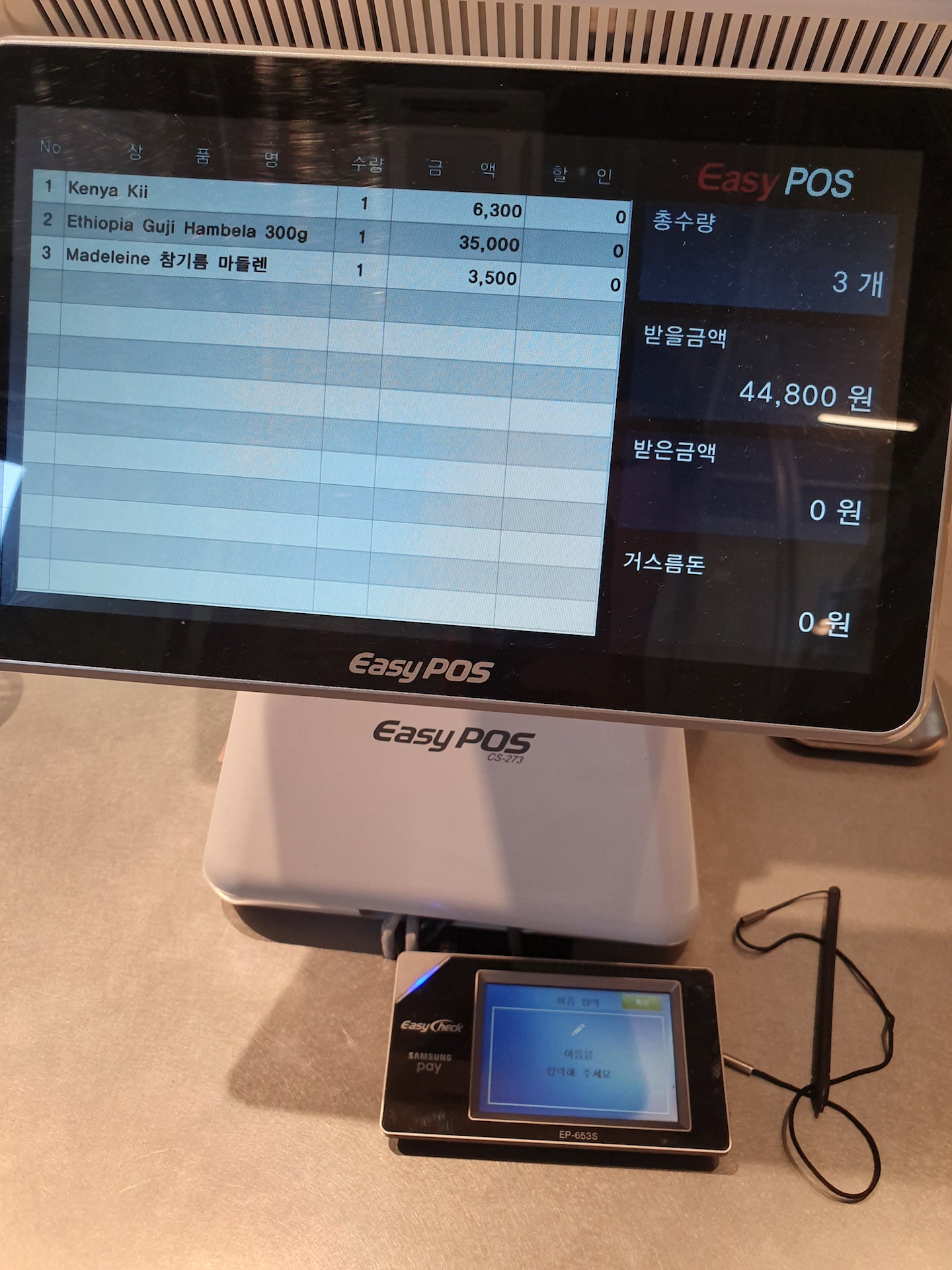 드립커피(이 날은 케냐였습니다), 마들렌, 싱글오리진 원두.