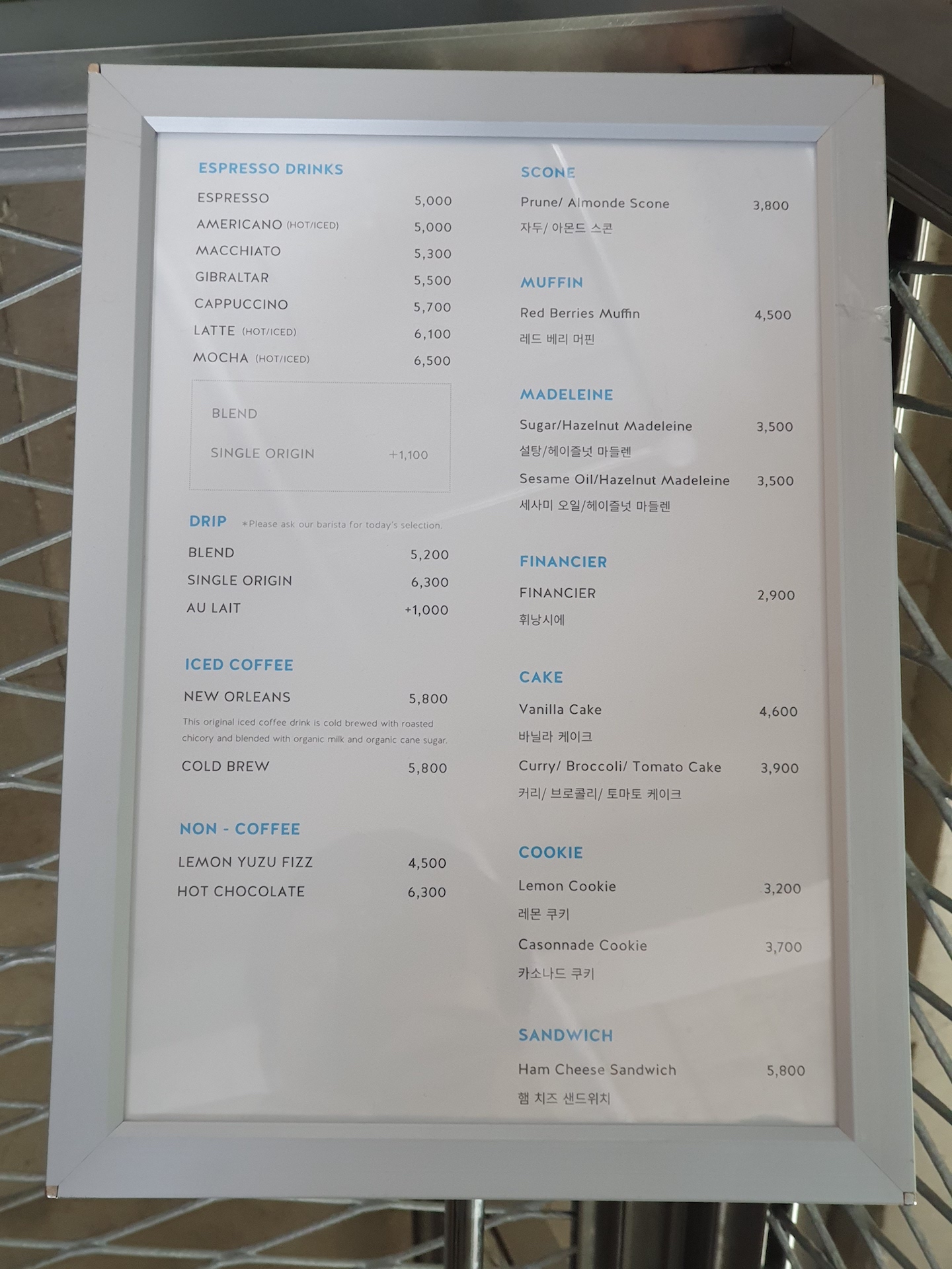 커피류는 영어로만 표기되어 있고, 음식 메뉴들은 한글로도 같이 표기가 되어 있네요.