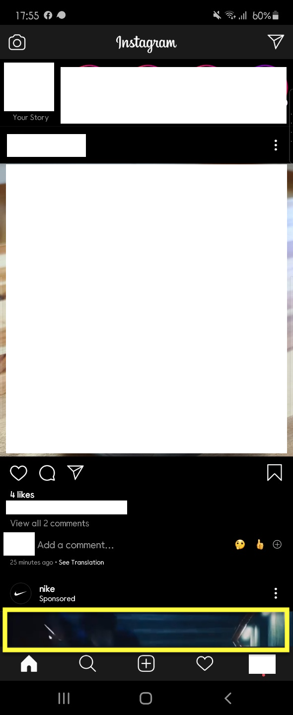 예시 화면입니다. 눈은 가운데에 있는 게시물을 보고 있는데, 갑자기 아래의 나이키 게시물의 소리가 나면서 동영상이 재생됩니다.