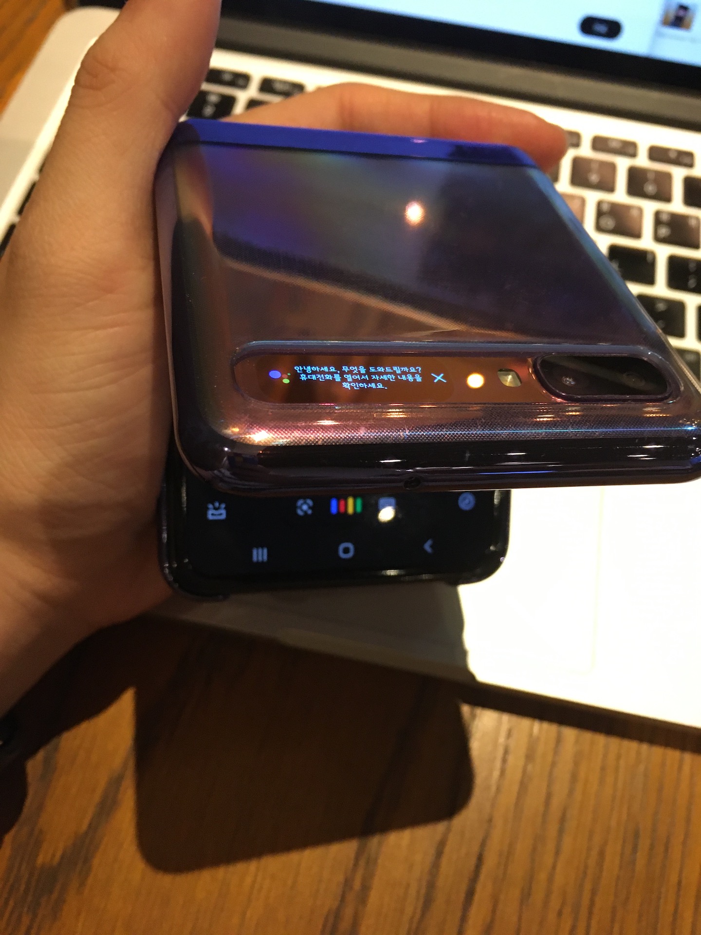 그리고 구글 어시스턴트 불러내면 외부 화면에 뭔가 뜨는데... 이걸 굳이 왜? (완전 펼쳤을 때도 뜸)