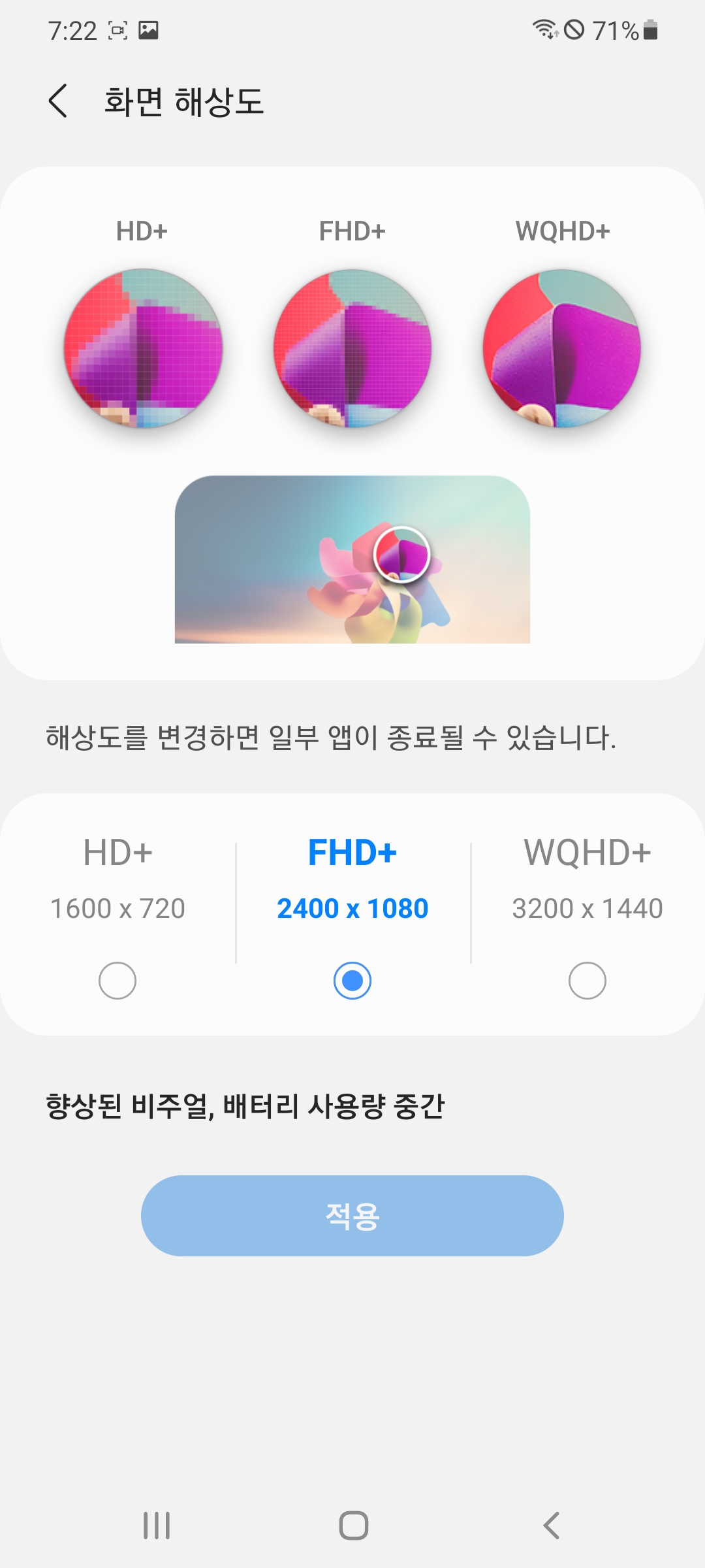 울트라 모델은 WQHD+에 120Hz를 지원하는데, 투고 서비스로 핸드폰을 처음 받았을 때에는 FHD+로 설정이 되어 있더라고요.