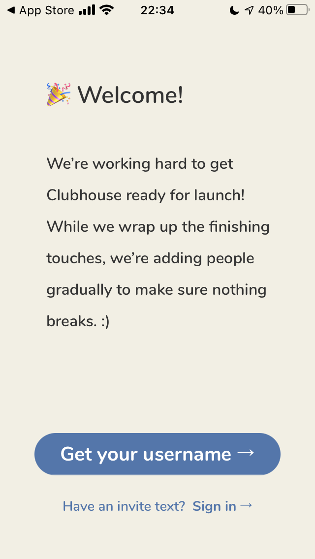 Hey! We're working hard to add people to Clubhouse as fast as we can, but right now you need an invite to sign up. Anyone can get one by joining the waitlist, or by asking an existing user for one. We really appreciate your patience and can't wait to we
