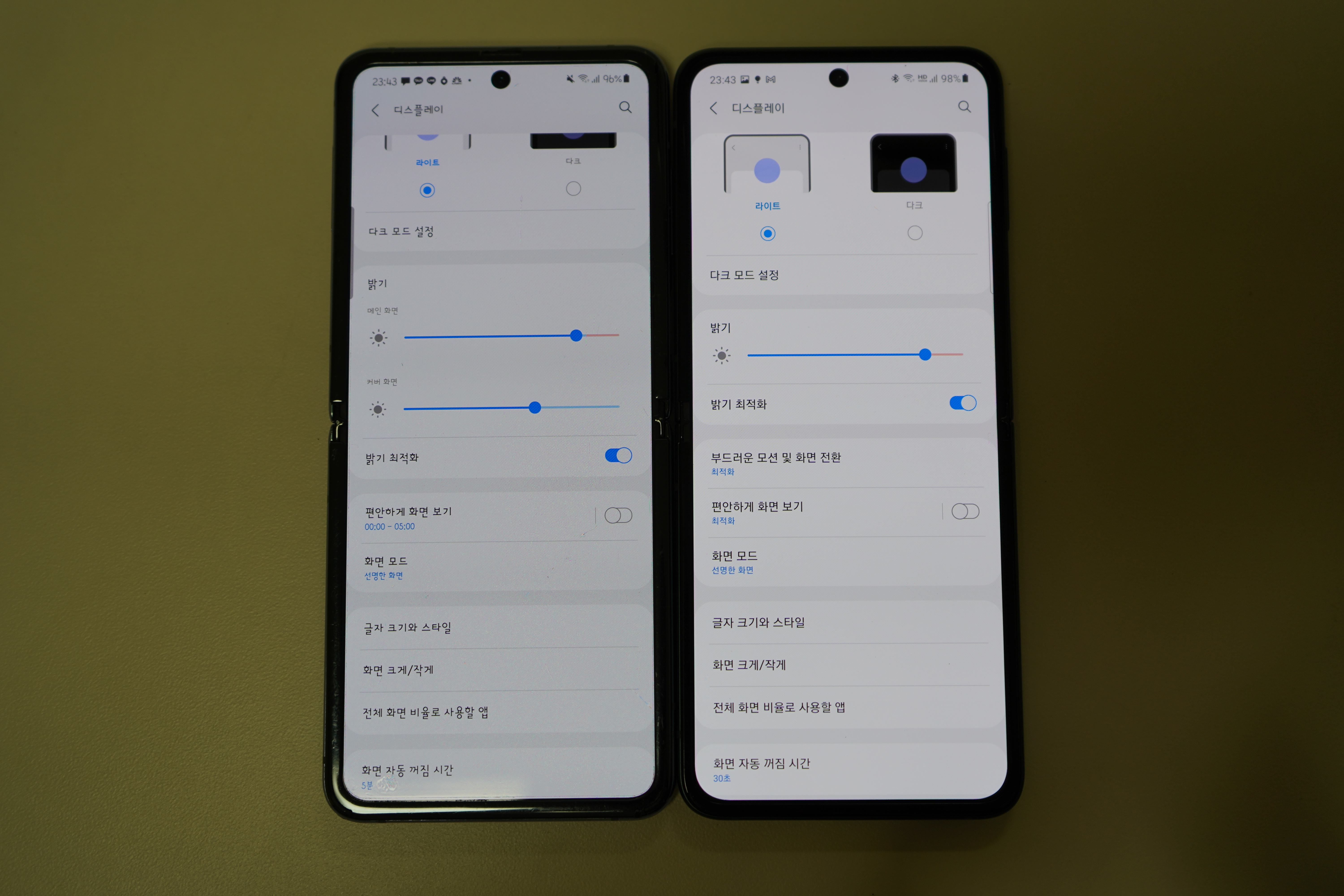둘 다 케이스 없는 상태에 밝기는 중간에 놓았으며, Z플립3은 부드러운 화면 옵션(120Hz)을 켠 상태입니다.
