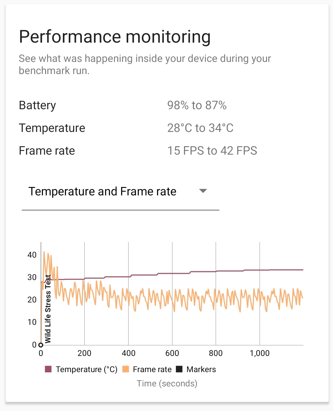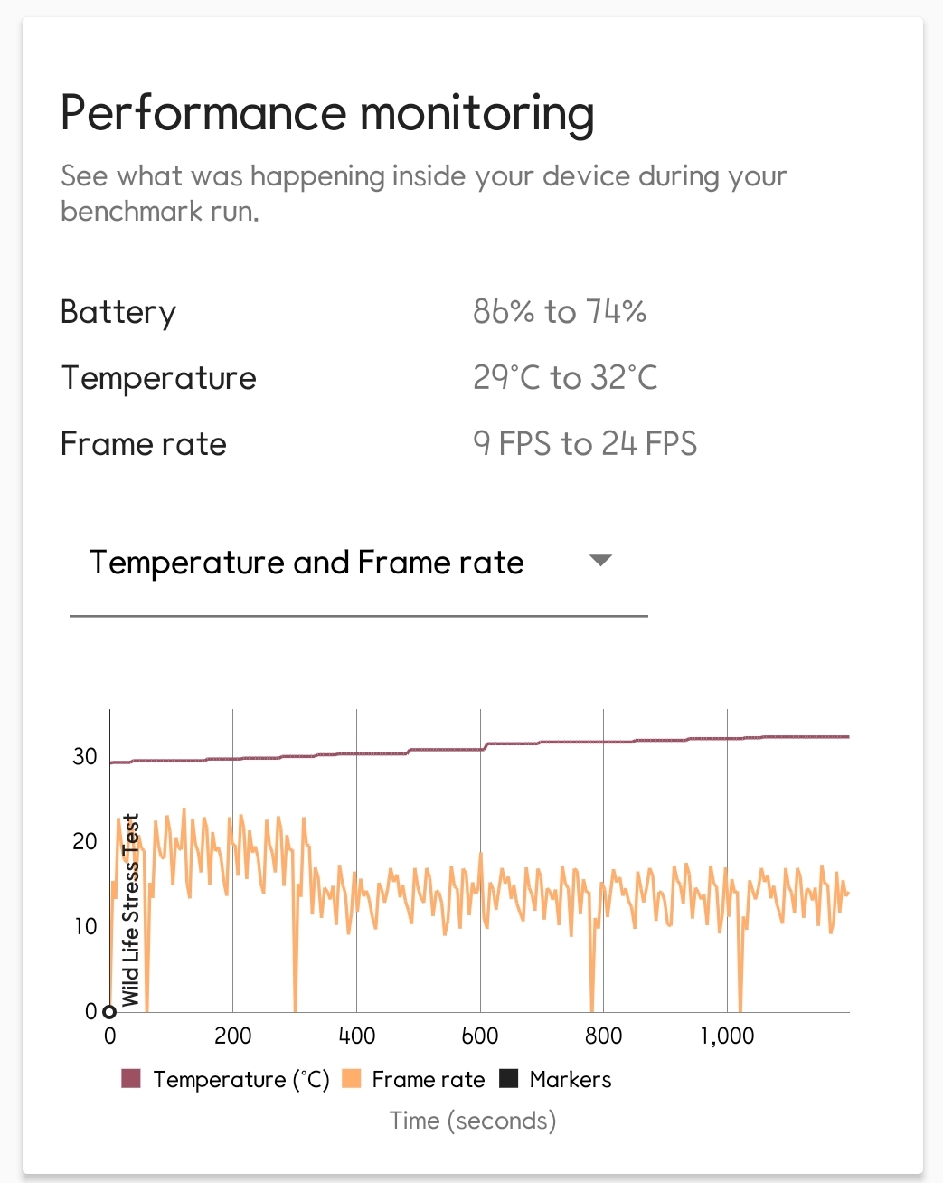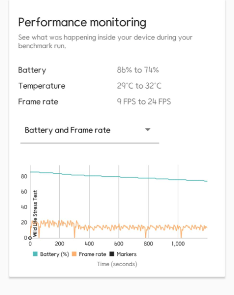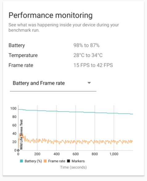 동일한 테스트 (3DMARK의 Wild Life Stress Test) 후 배터리 소모량입니다.