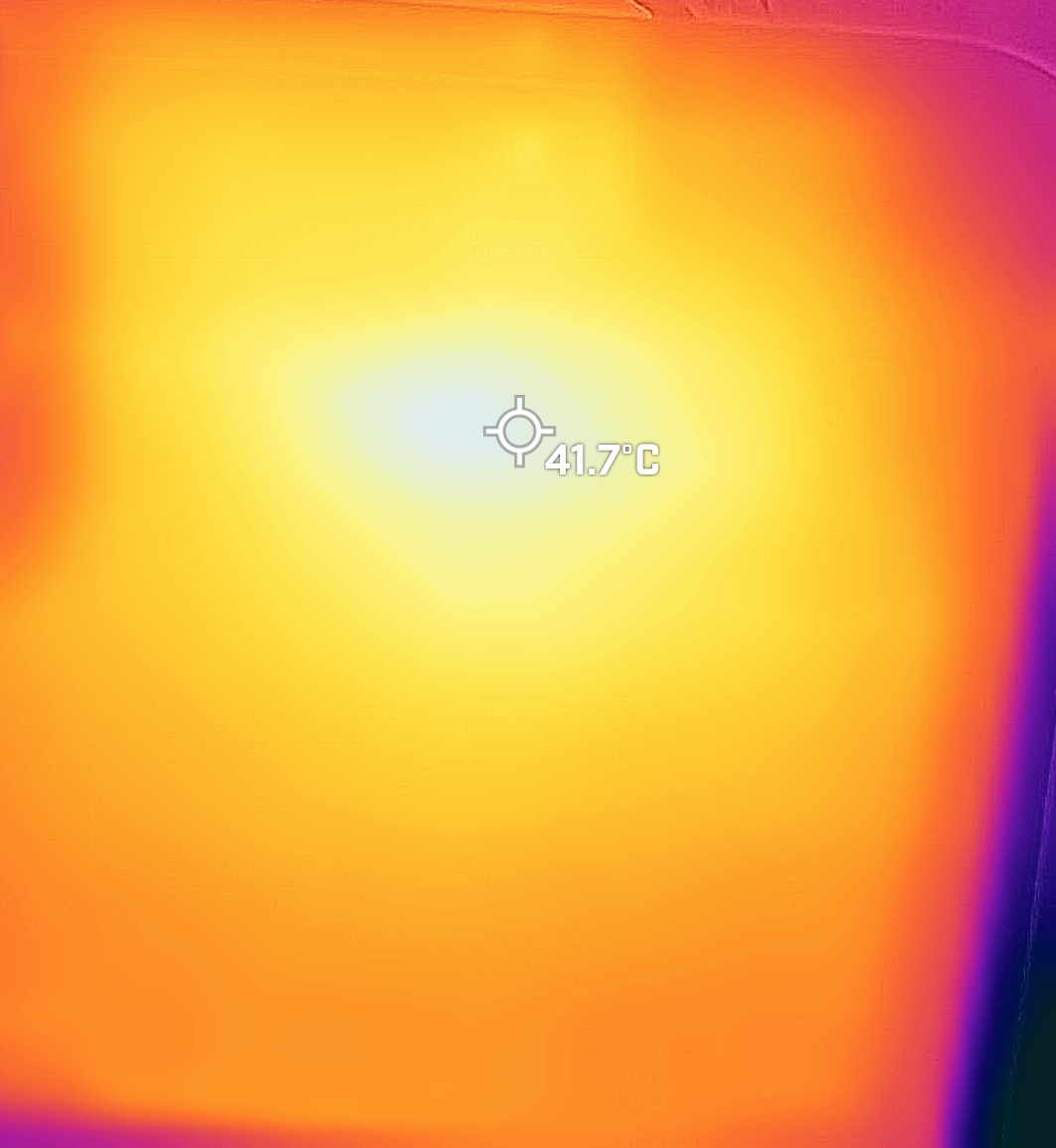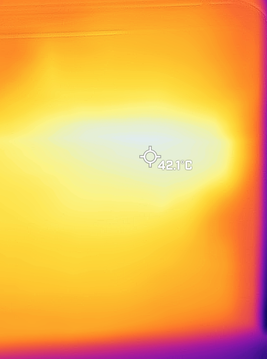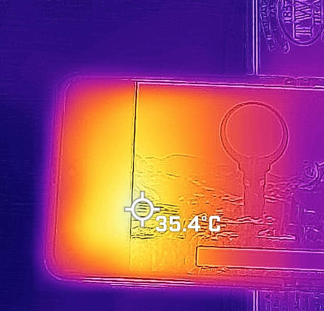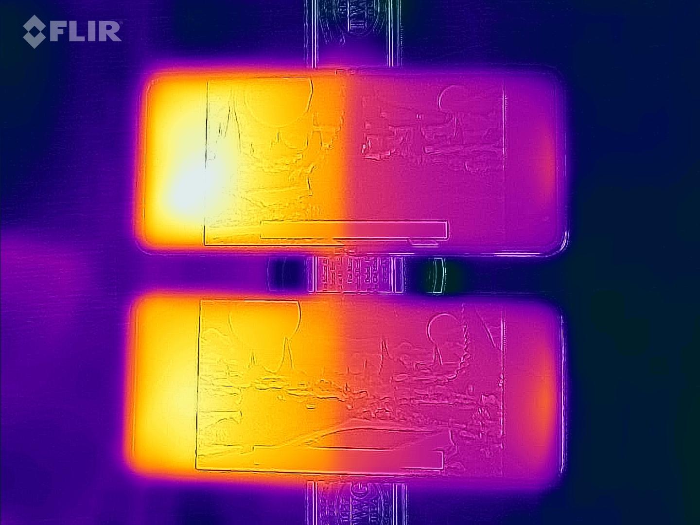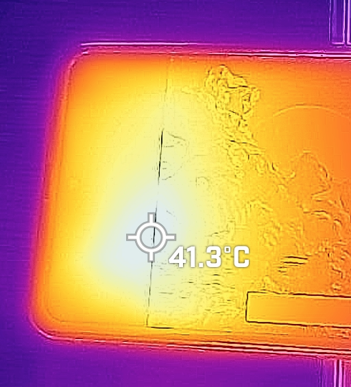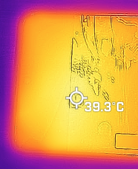 테스트 20 loops 끝나기 조금 전에 찍은 온도. 위는 화면쪽 / 아래는 뒷면 표면 온도.