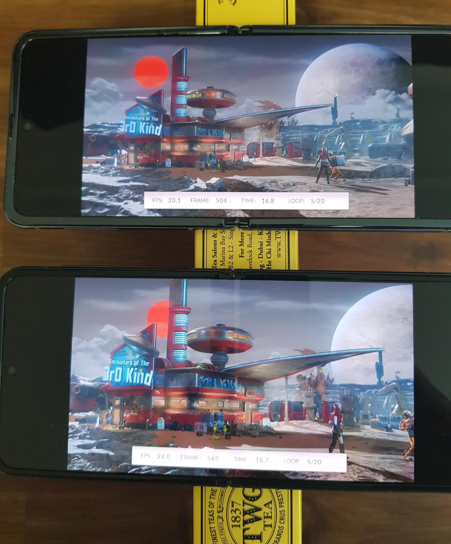 오른쪽 Z플립은 그래프가 중간에 바닥을 찍습니다. Frame rate가 0이다 = 화면이 멈췄다는거죠.