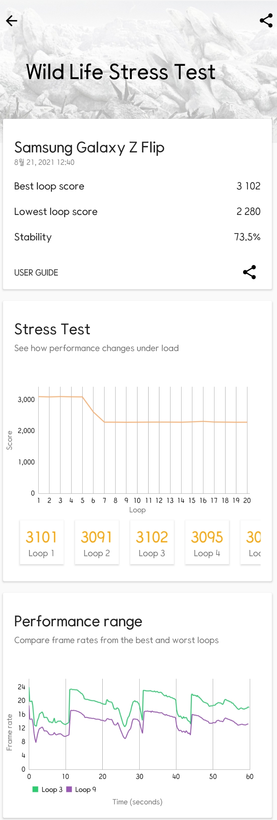 맨 아래 그래프를 보시면 왼쪽의 Z플립3은 Frame rate가 15~25 사이를 유지해주는데요 (벤치마크 내에서의 frame rate)