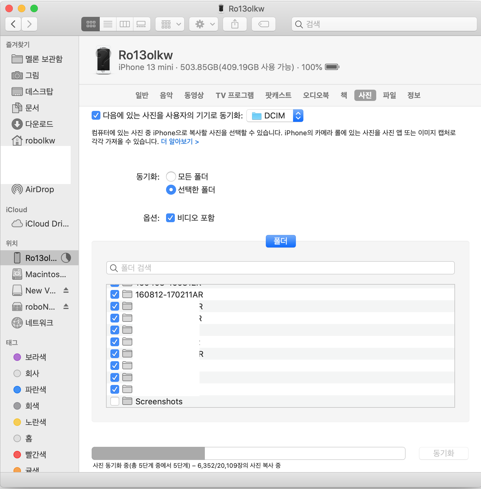 단, 이런 경우 아이폰에서 저 폴더들에 사진을 추가하거나 삭제할 수는 없어요. 무조건 컴퓨터에서 추가/삭제 후 동기화 해줘야 합니다.
