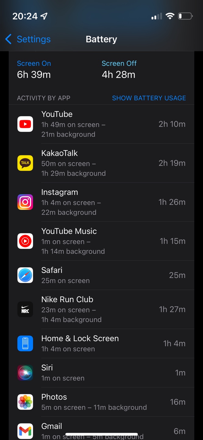 유튜브도 보고 에어팟도 쓰고, 퇴근 후에도 좀 썼는데 이 정도면 배터리 사용은 만족합니다.
