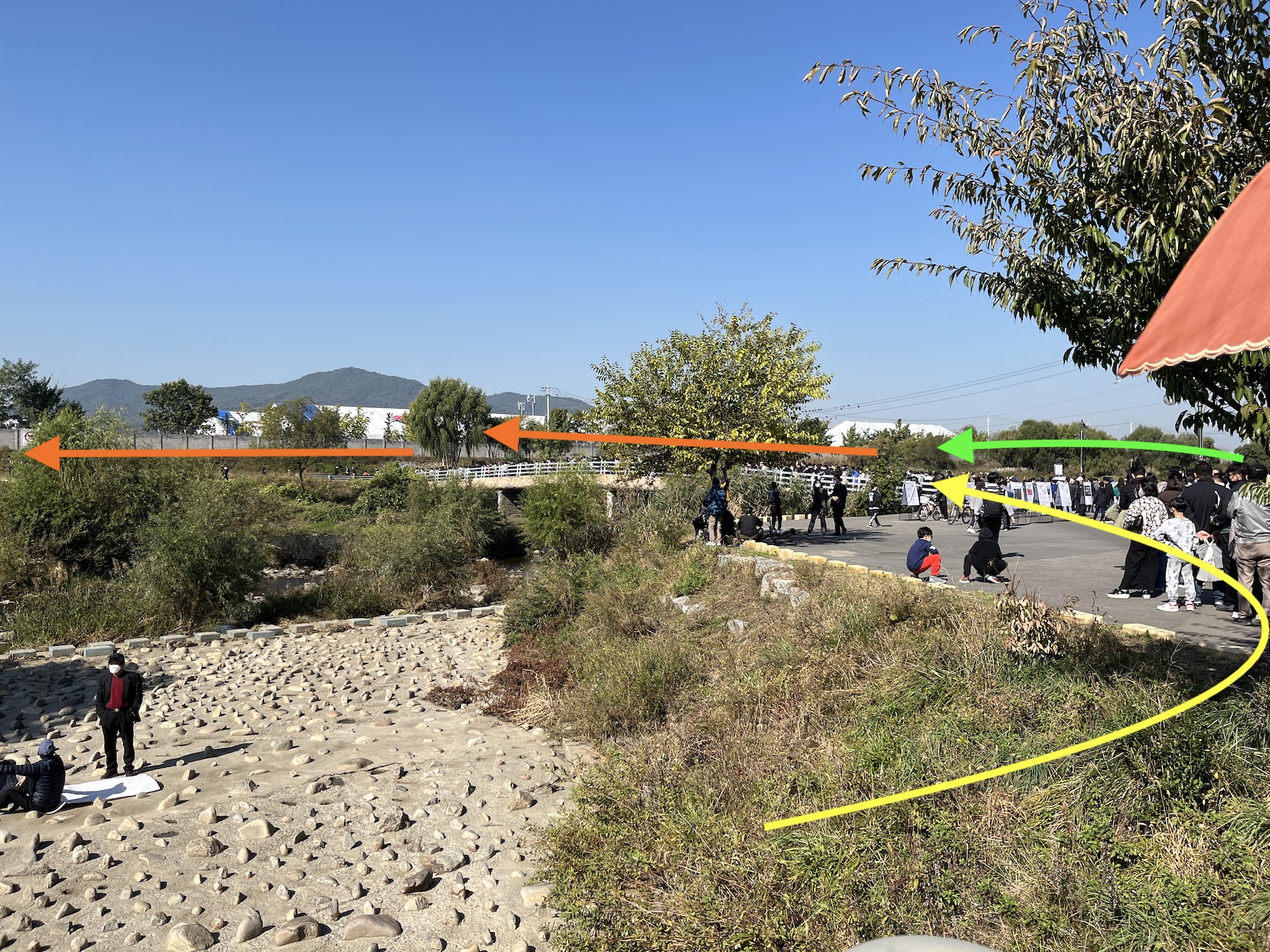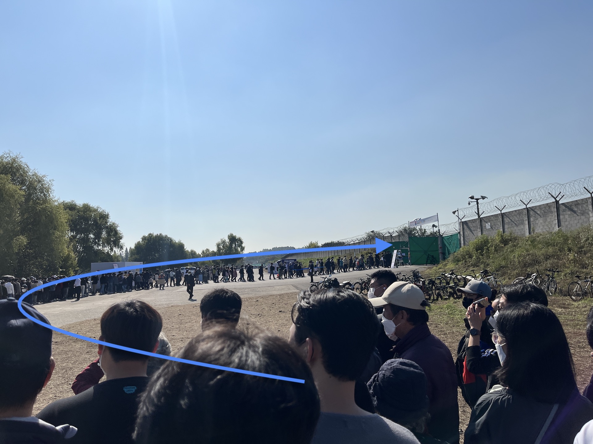 그리고 화살표 방향으로 가야 입구가 나오는데, 앞에 누적된 사람들이 입장을 못해서 다리에 있는 사람이 한참동안 못 빠지고, 따라서 노랑색 초록색 화살표쪽 대기 인원도 줄을 서 있는 상황. 탄천 옆길이라 자전거길엔 자전거 탄 사람들도 가득하고 정말 사람 가득... ADEX에 이렇게 관심이 많았어요? ㅋㅋㅋㅋ세상에.