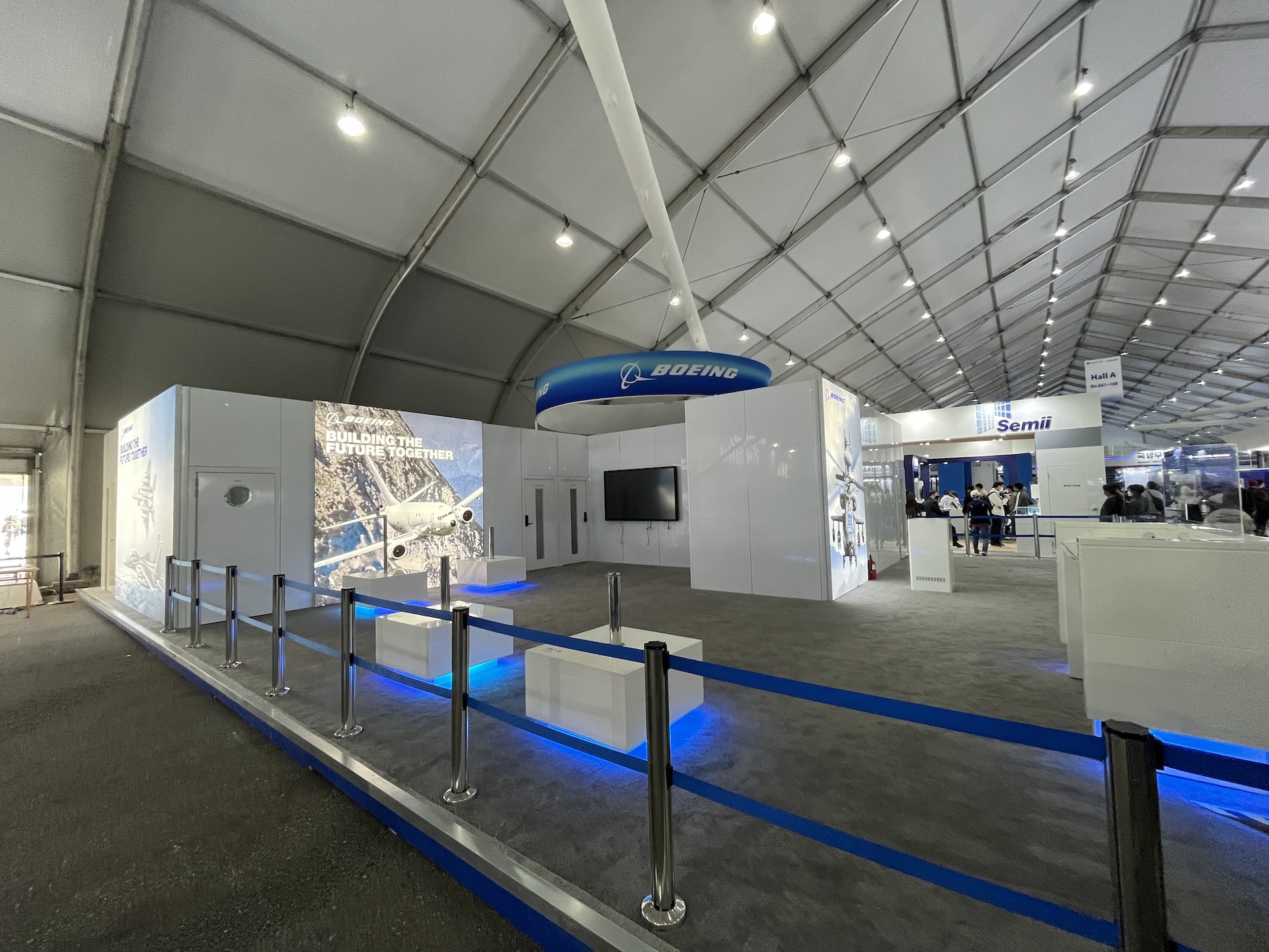 벽에 이미지만 있고 텅 빈 보잉 부스.