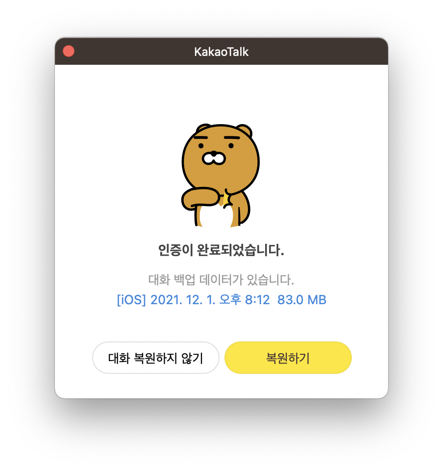 백업 데이터를 카카오 계정에 백업된 것에서 가져오게 되는 것이죠.