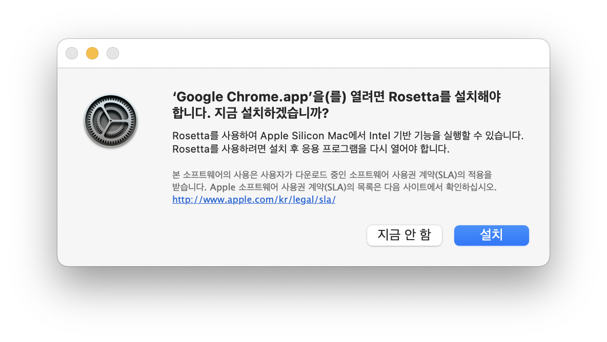 Rosetta란 위 스크린샷에 써있듯, Apple Silicon을 사용하는 맥에서 Intel CPU 기반의 프로그램을 실행할 수 있도록 해주는, 일종의 에뮬레이션하는 프로그램...이라고 보면 되는데요.