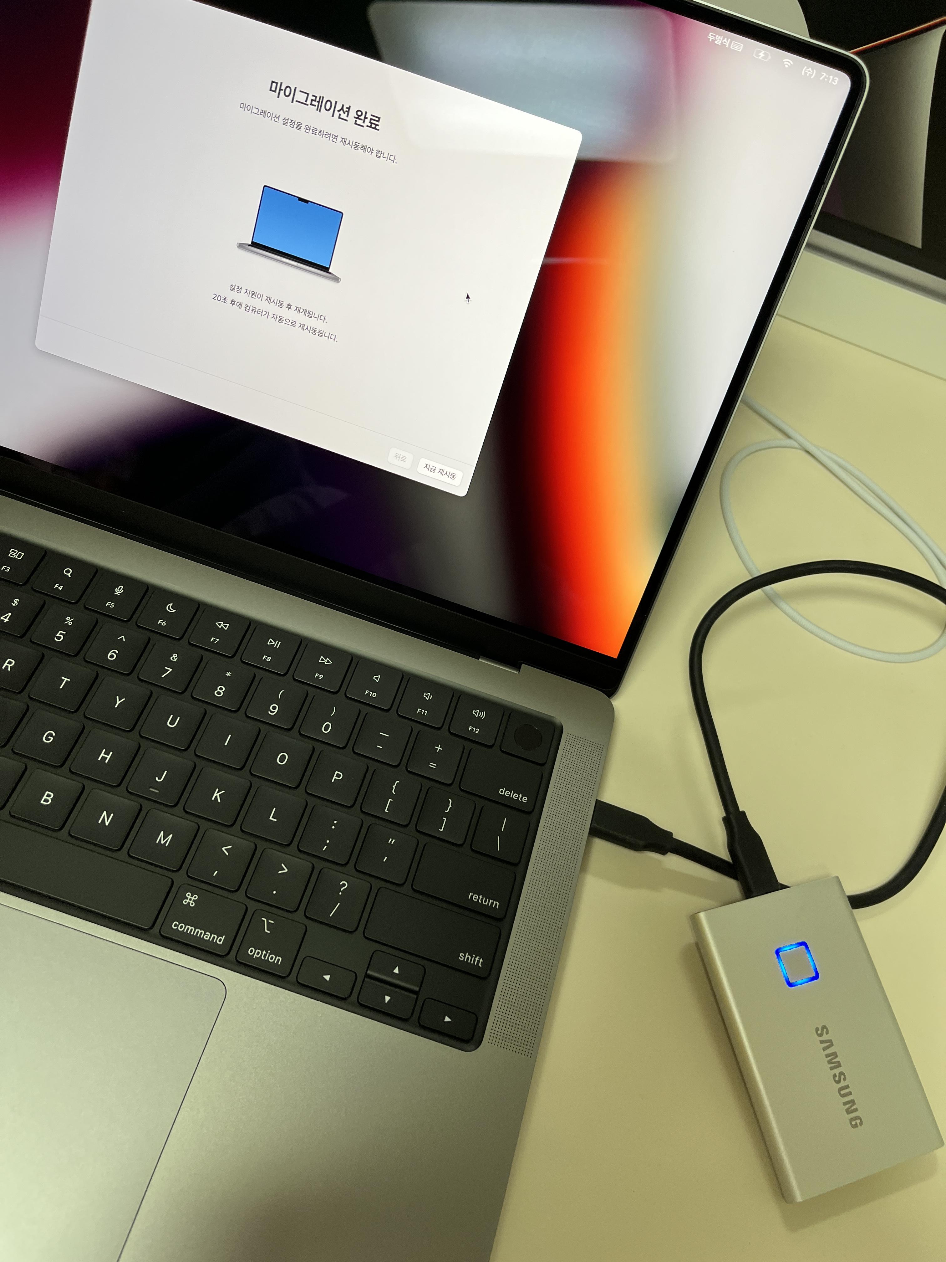 이전 맥북에 SSD를 연결해서 타임머신 백업을 만들고, 그 백업본을 새 맥북에 복원하였습니다.