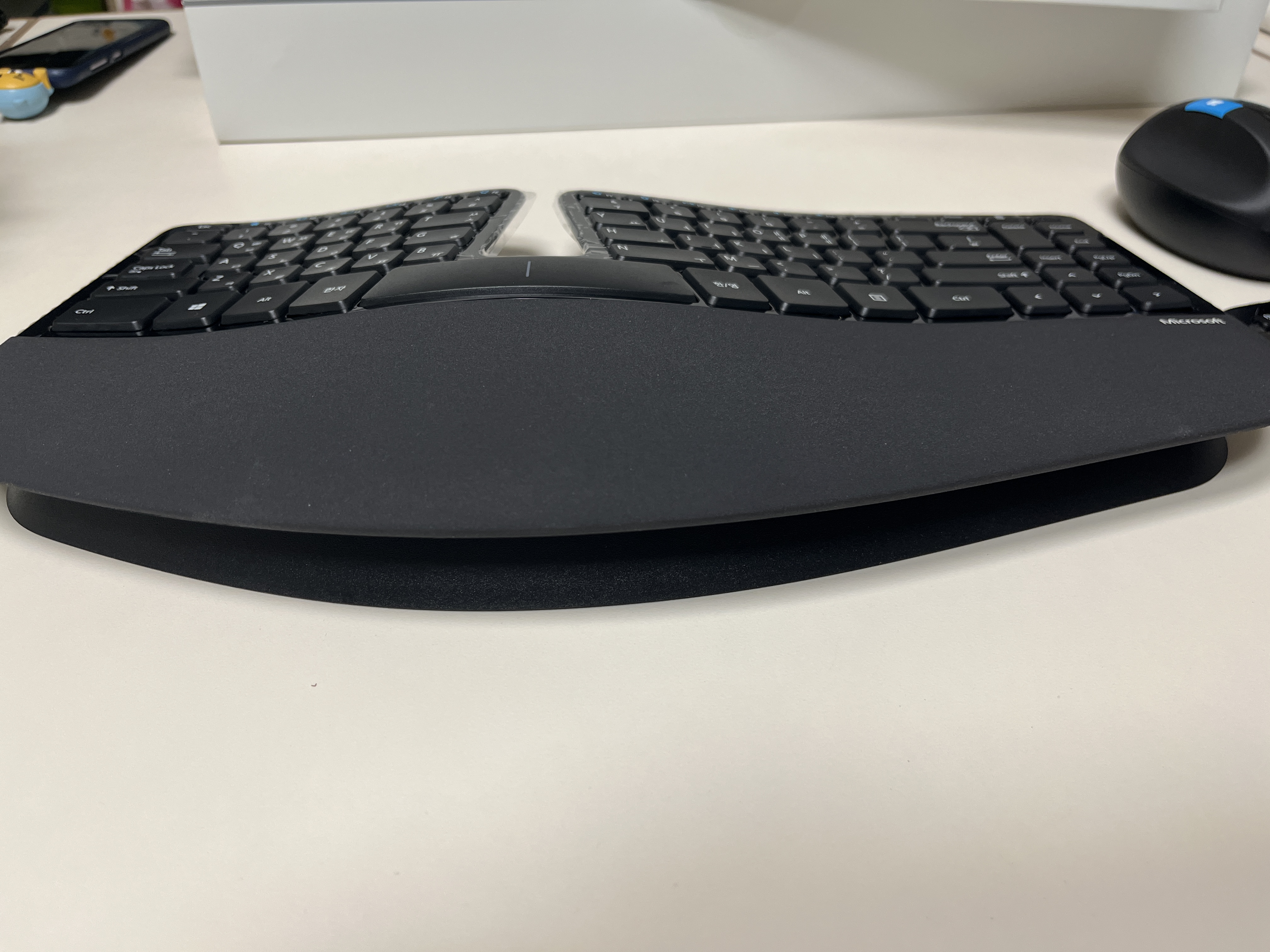 단점: 키패드가 맨날 이상한데 가 있어서 책상 뒤적거려 찾아서 쓰기 전에 그냥 윗줄 숫자키를 누른다, 마우스가 좀 높은 편이라 잘못 잡으면 오히려 손목이 아프다, 가운데 나뉘어있는 좌우 키 쪽에 오타가 좀 생긴다 (적응 시간이 더 필요할듯)