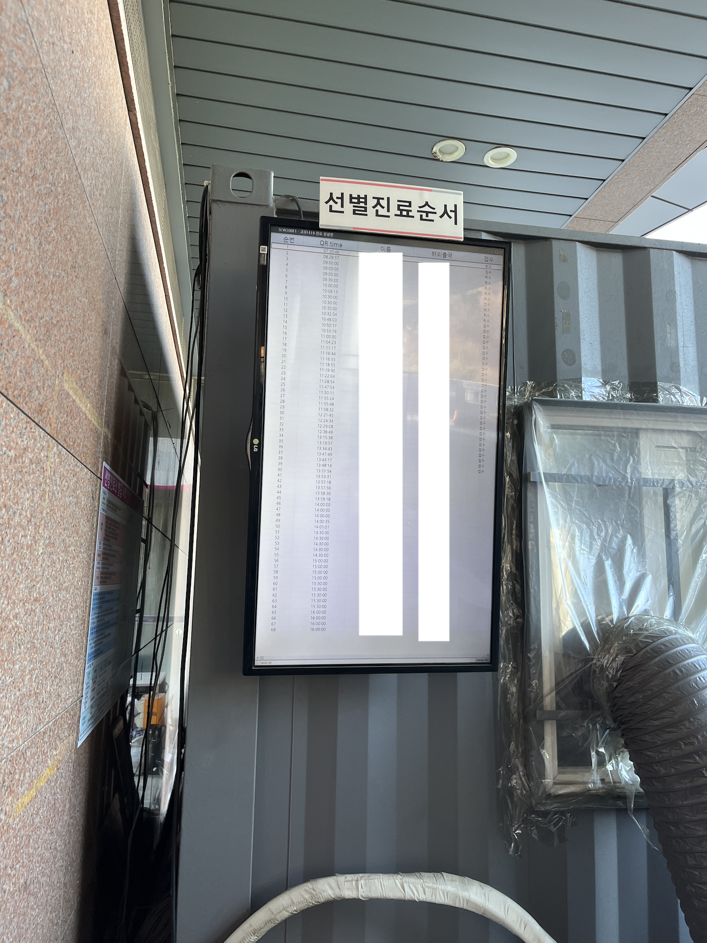 한쪽 벽에 선별진료 순서를 표시하는 디스플레이가 있습니다.