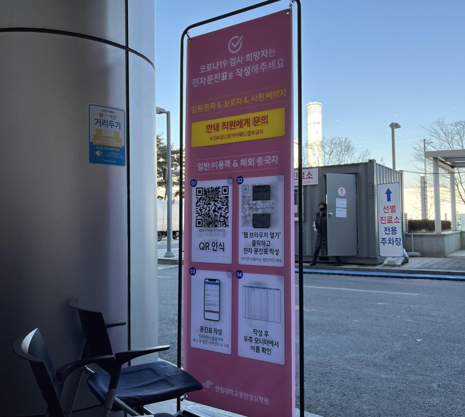 출입용 QR코드가 필요한데요, 카카오/네이버 QR코드랑 다른 병원 전용 QR코드라 벽면에 있는 태블릿으로 간단한 문진 및 휴대폰 번호 입력을 통해 발급받으셔야 합니다. (보호자 1인 동행 시, 한 명만 해도 가능)
