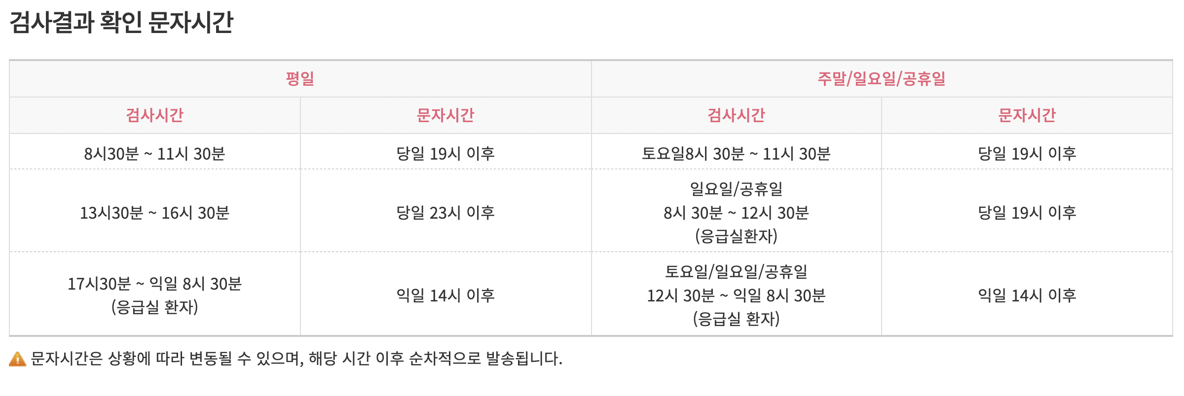 검사 시간과 결과 확인 문자 수신 시간이 미리 공지되어 있네요!