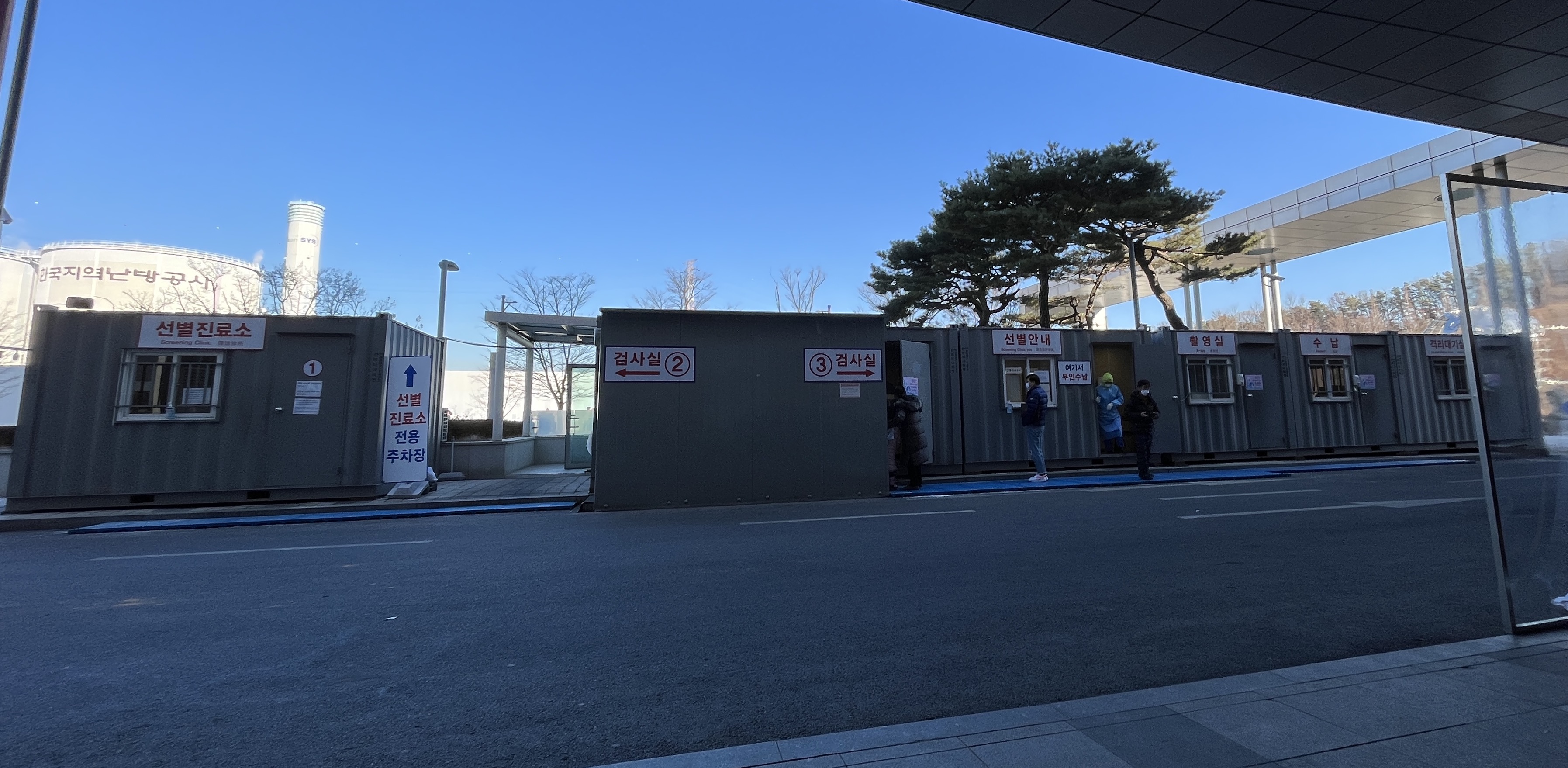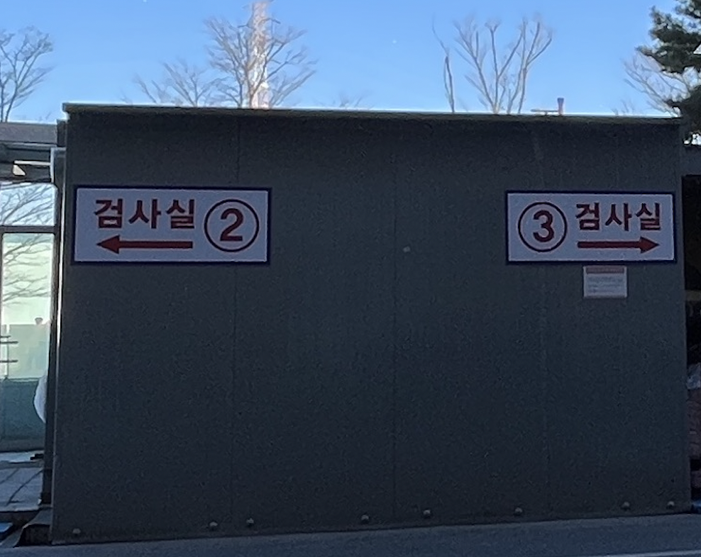 지하주차장에서 올라오면 선별진료소와 검사실2 사이에 있는 유리문으로 올라와서, 맞은편 대기공간에서 대기하게 돼요.