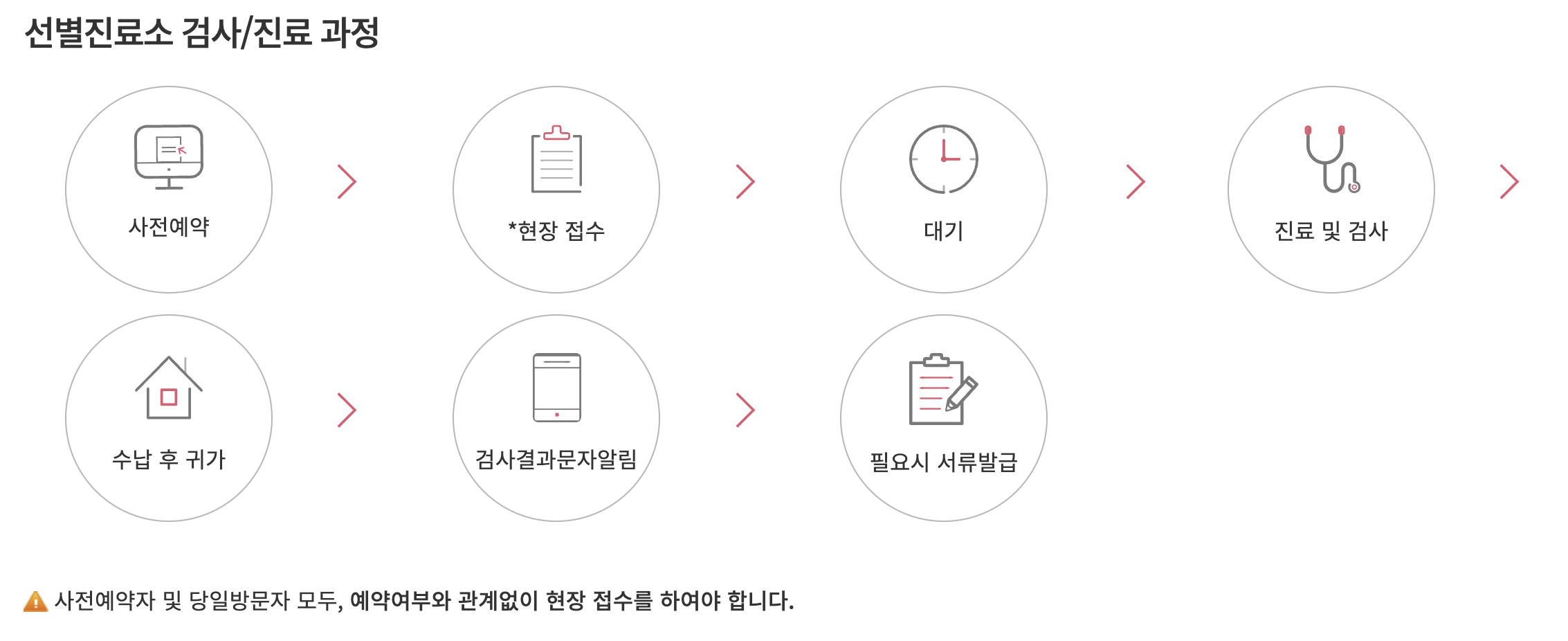 검사 받는 경우에는 왼쪽의 "선별진료소 전용 주차장"에 주차해야 합니다.