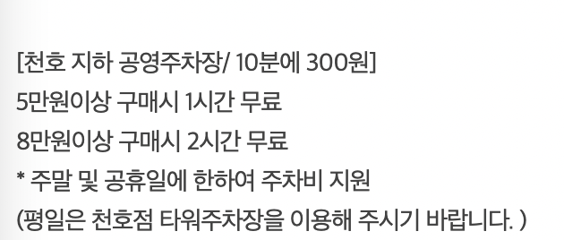 8만원 이상 구매하면 2시간 무료 주차권을 받을 수 있습니다.