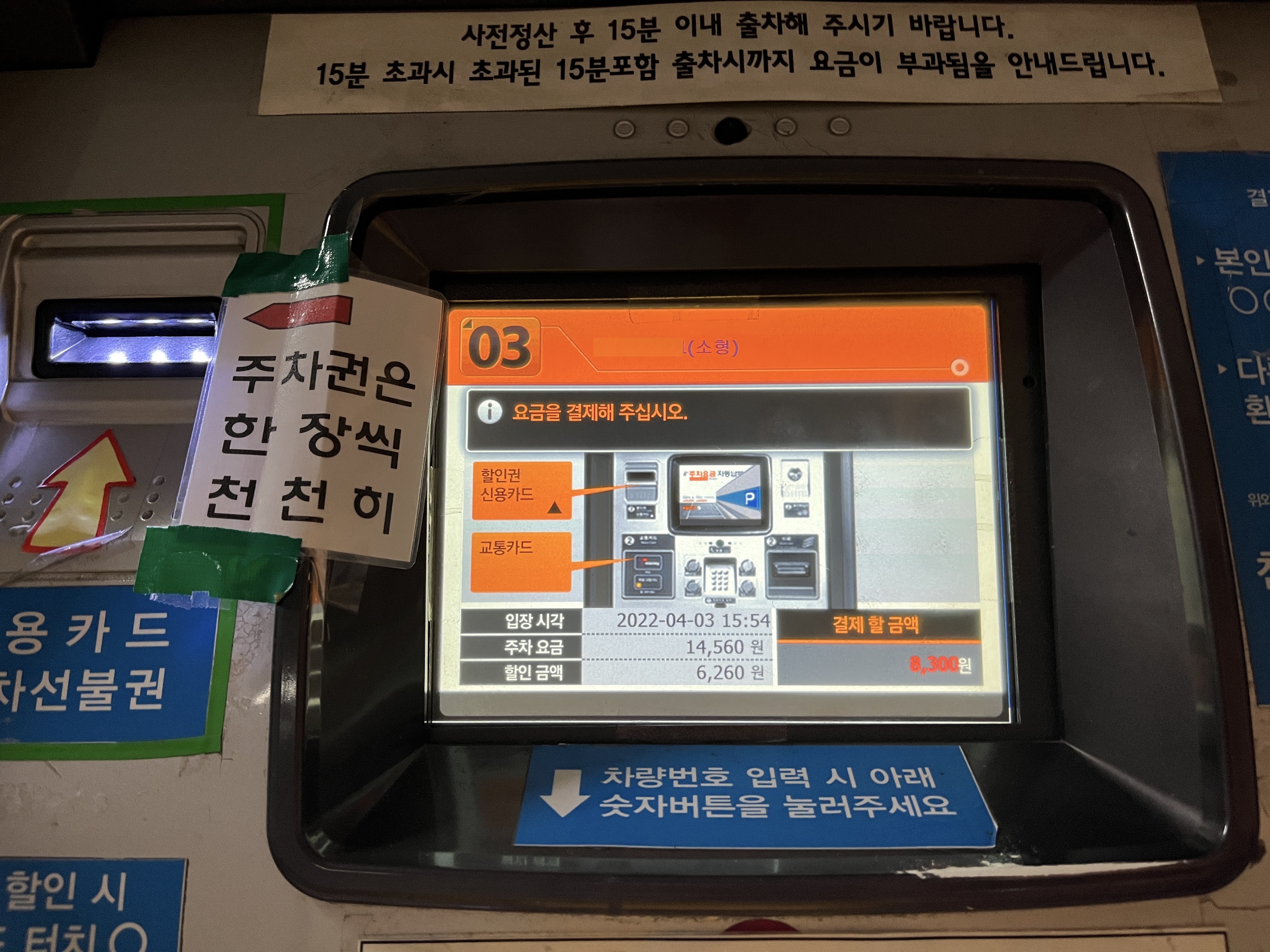 4시간 37분이었고, 주차 요금에 표시되는 금액은 4시간 40분에 해당하는 요금인 14560원이 나왔네요.