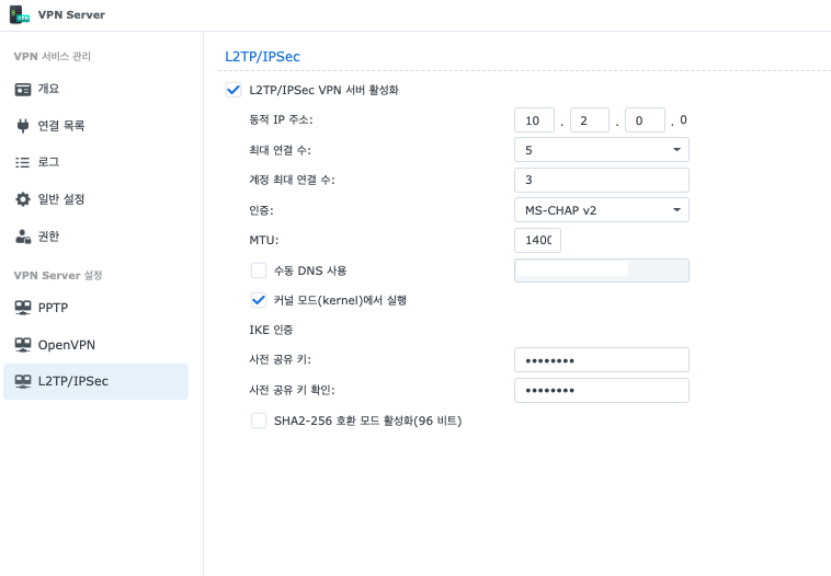 활성화 체크, 아래와 같이 설정(기본 설정), "사전 공유 키"는 원하는 비밀번호로 설정하고 따로 기억하고 있어야 합니다.