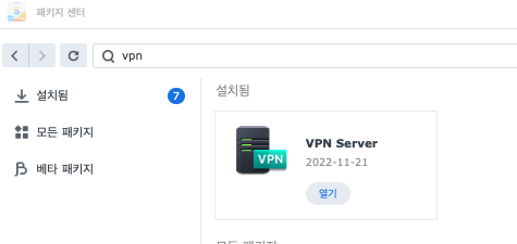 1) Synology NAS 관리 콘솔에 접속해서, 패키지 센터를 열고, VPN Server를 설치합니다.