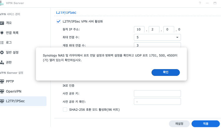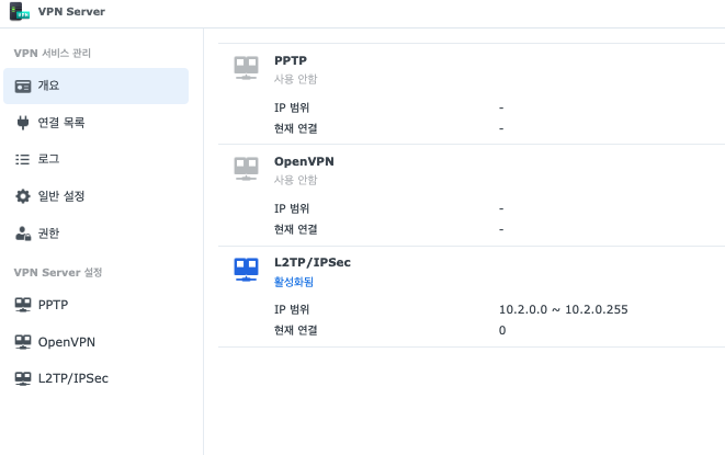 이러면 시놀로지 쪽에서 해줄 VPN 설정은 끝났습니다.
