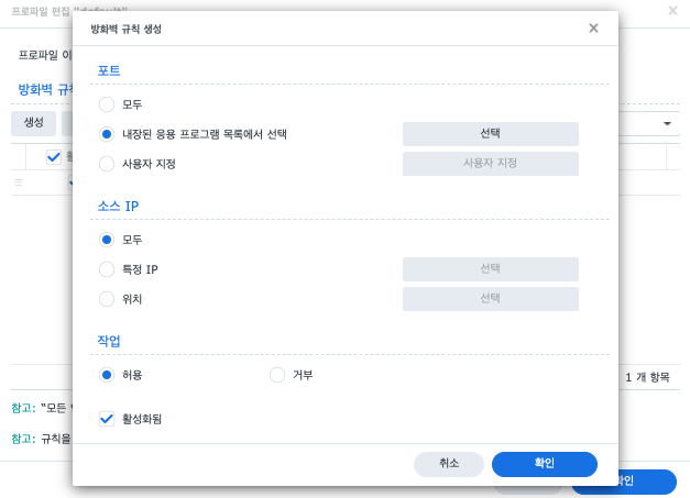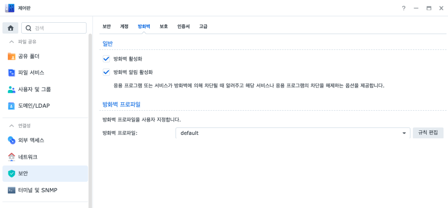 5) 시놀로지 관리 콘솔 내 제어판 - 보안 - 방화벽