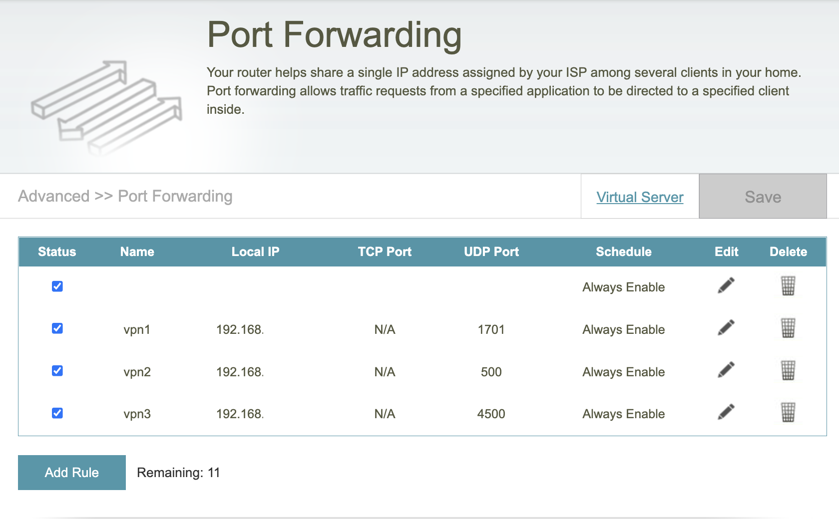 위와 같이 통신사공유기를 위에 하나 더 쓰는 경우라면, 통신사 공유기 페이지에 들어가서 똑같이 UDP 1701, 500, 4500포트를 포트포워딩 추가해주되, <통신사 공유기>단에서는 NAS가 보이지 않을 것이므로 Local IP를 <개인 공유기>의 아이피로 넣으면 됩니다.