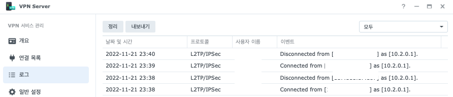 이때 시놀로지 관리 콘솔에서 VPN Server - 로그 들어가보면, 접속 로그가 잘 뜨는 것을 볼 수 있습니다.