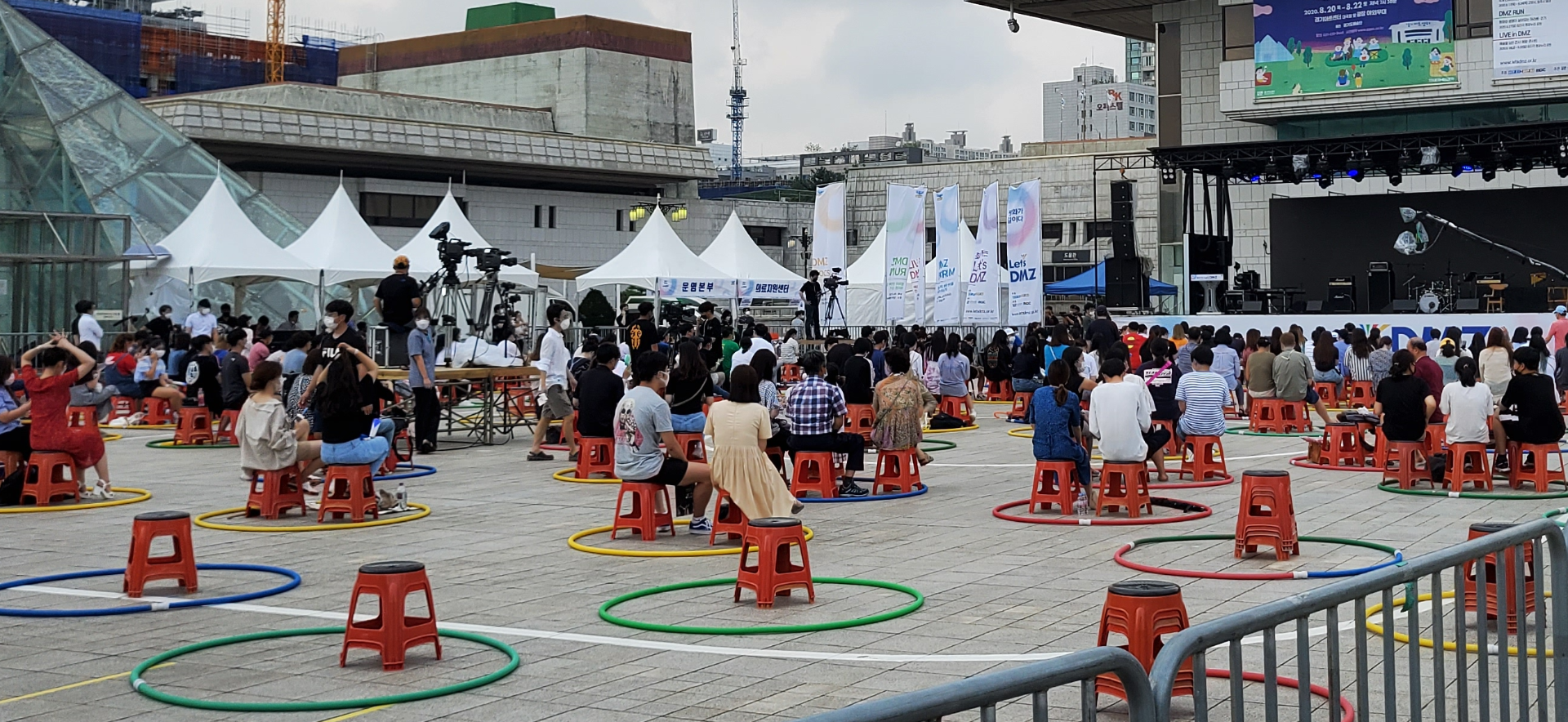 한 야외 행사에서는 사람들간 거리 확보를 위해 훌라후프 같은걸로 거리두기 표시를 해놓기도 했네요.