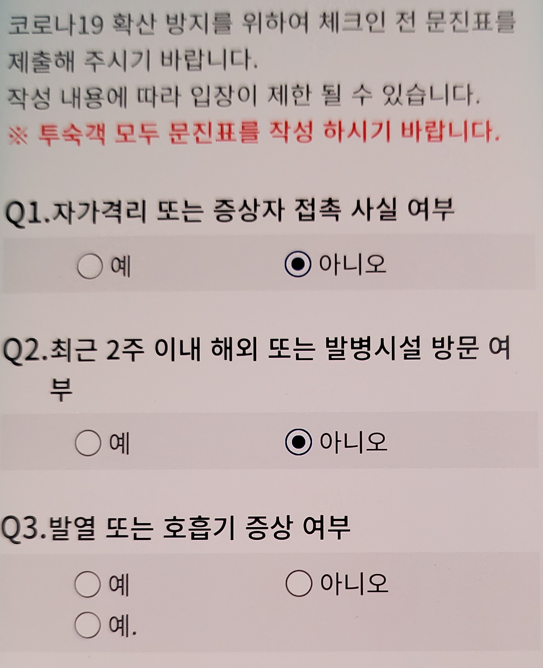 어딘가에 출입을 위해서는 이런 문진표 작성을 해서 미리 제출을 했어야 했습니다.