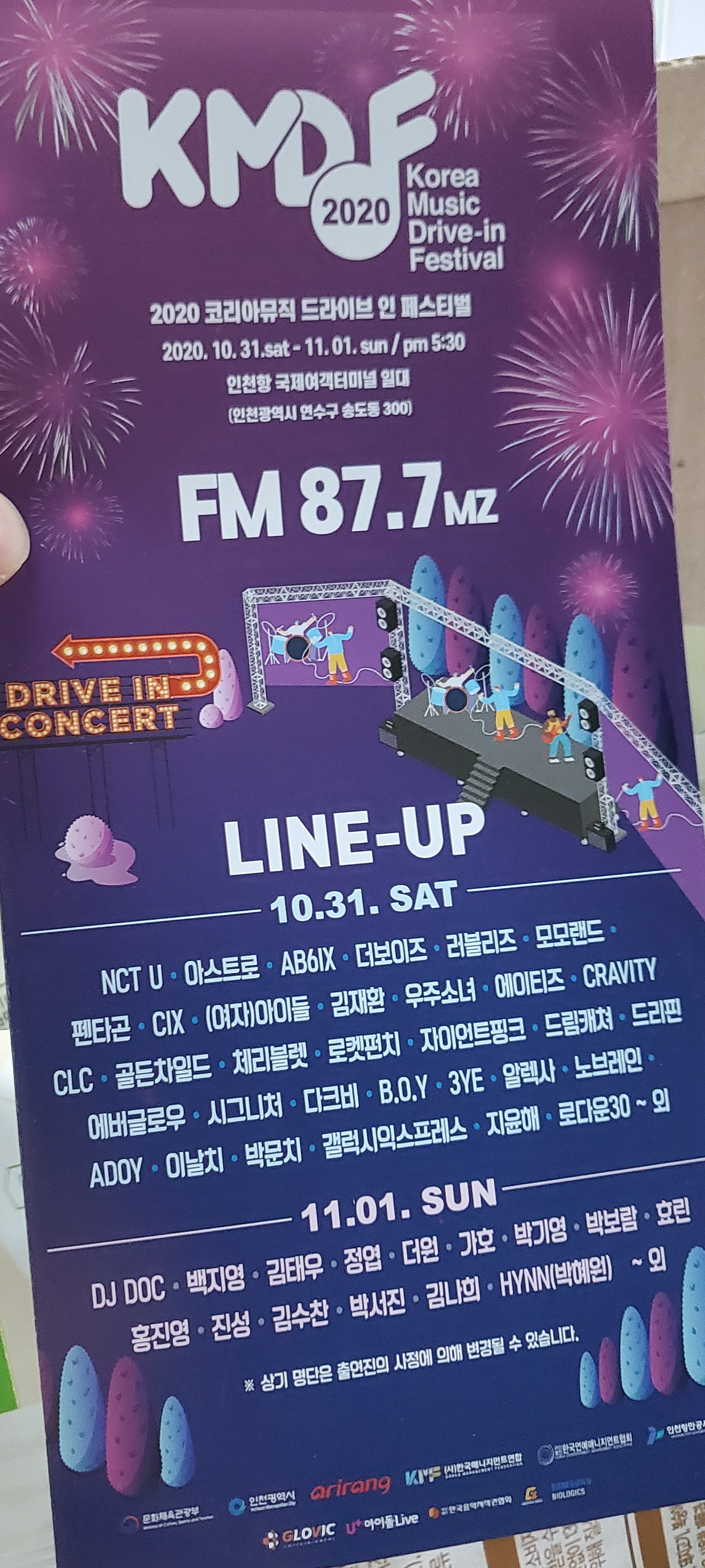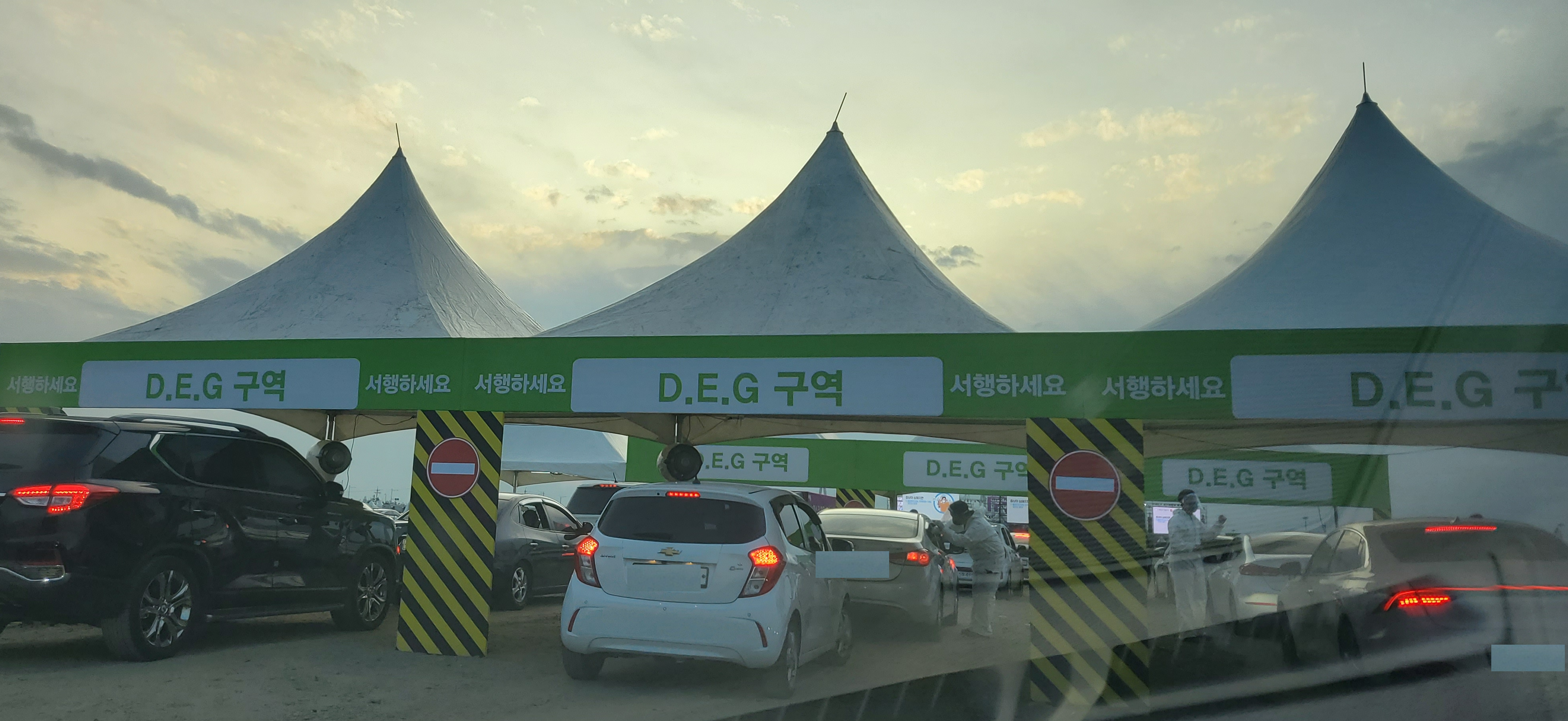 차량 (외부) 소독 구간을 통과해서 정해진 구역에 차를 주차하고 관람하는 방식이었습니다.