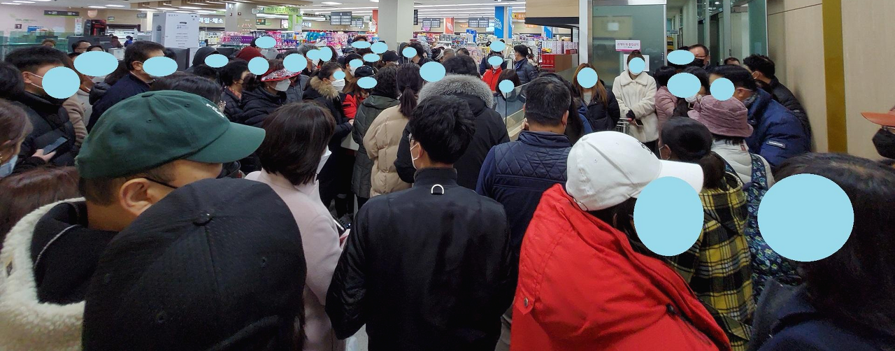 마스크를 사기 위해 마트에 가득한 사람들 (번호표 받고 대기중)