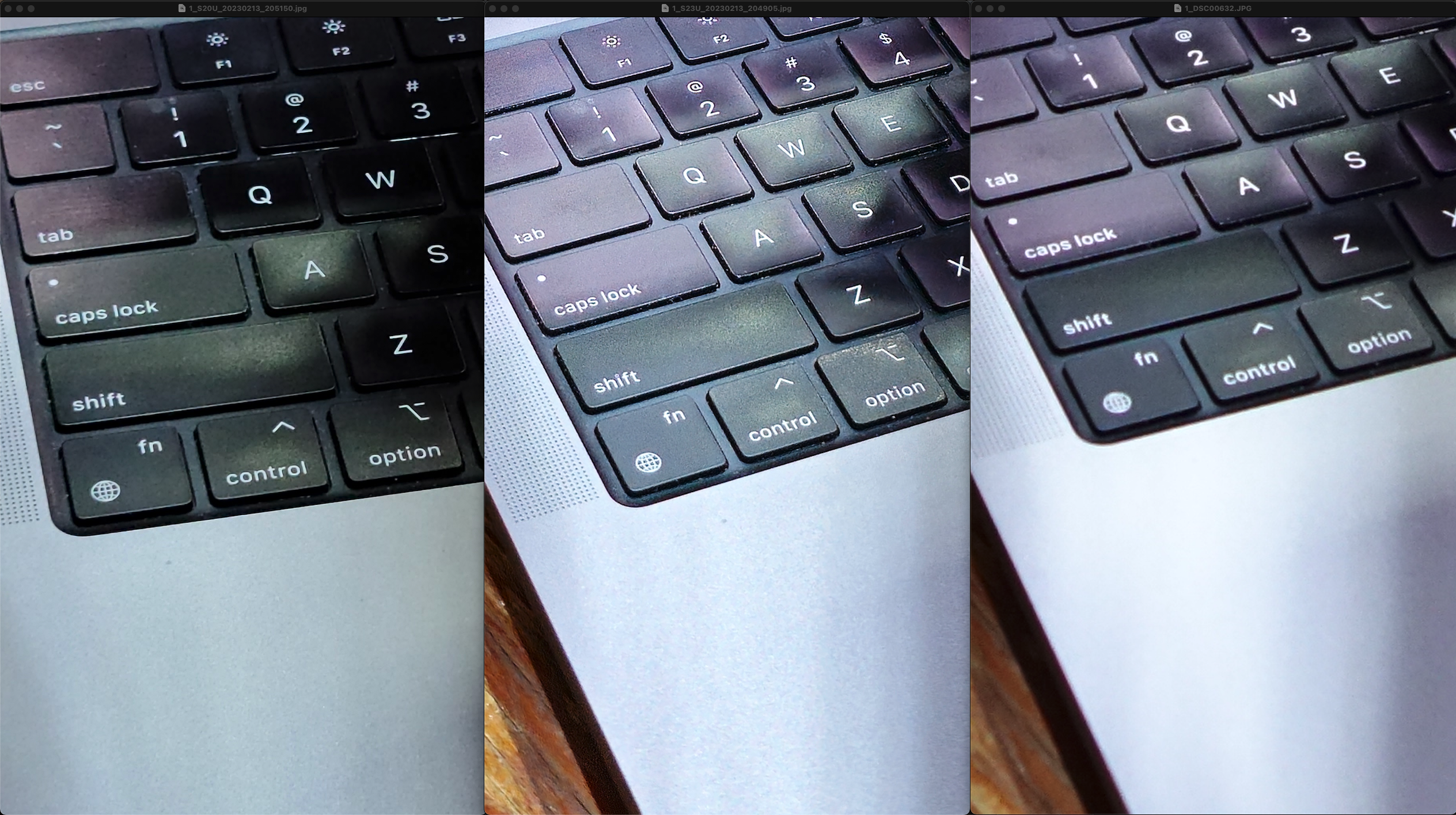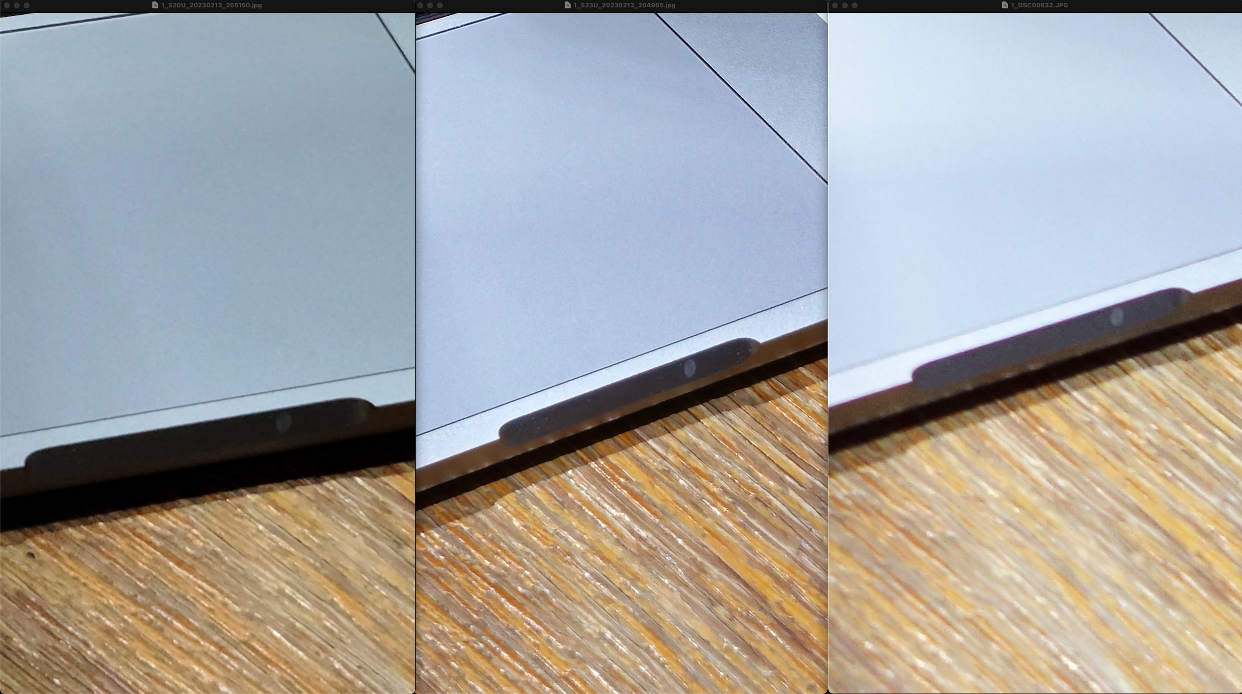 맥북 하판, 스피커 구멍이 S20U와 S23U는 굉장히 선명하게 보이고, RX100은 흐릿하게 보입니다.