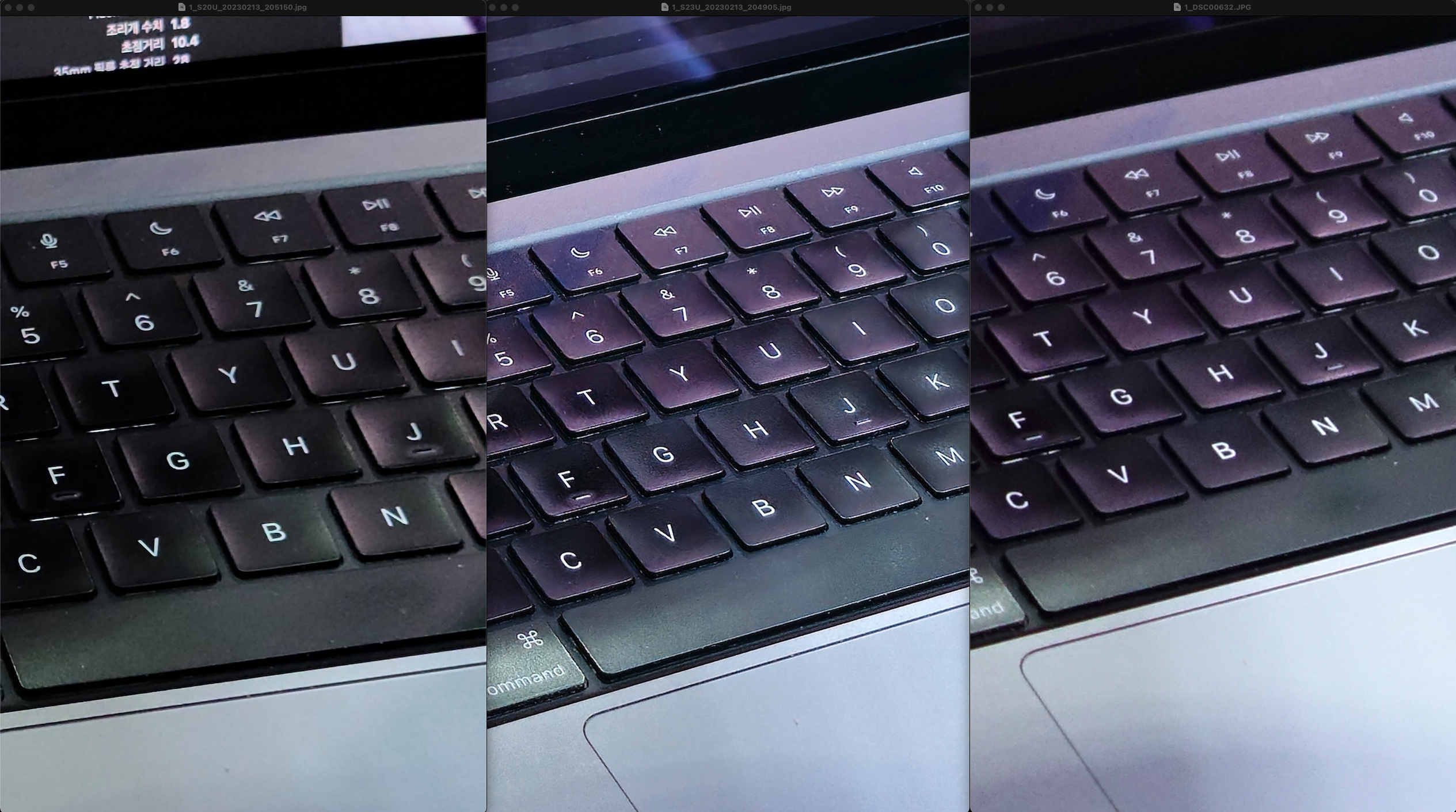 (화면에 뜬 사진의 밝기가 다르고, 맥북 각도도 다르므로 결과물도 당연히 동일선상에서 비교하기에 약간 무리가 있음)