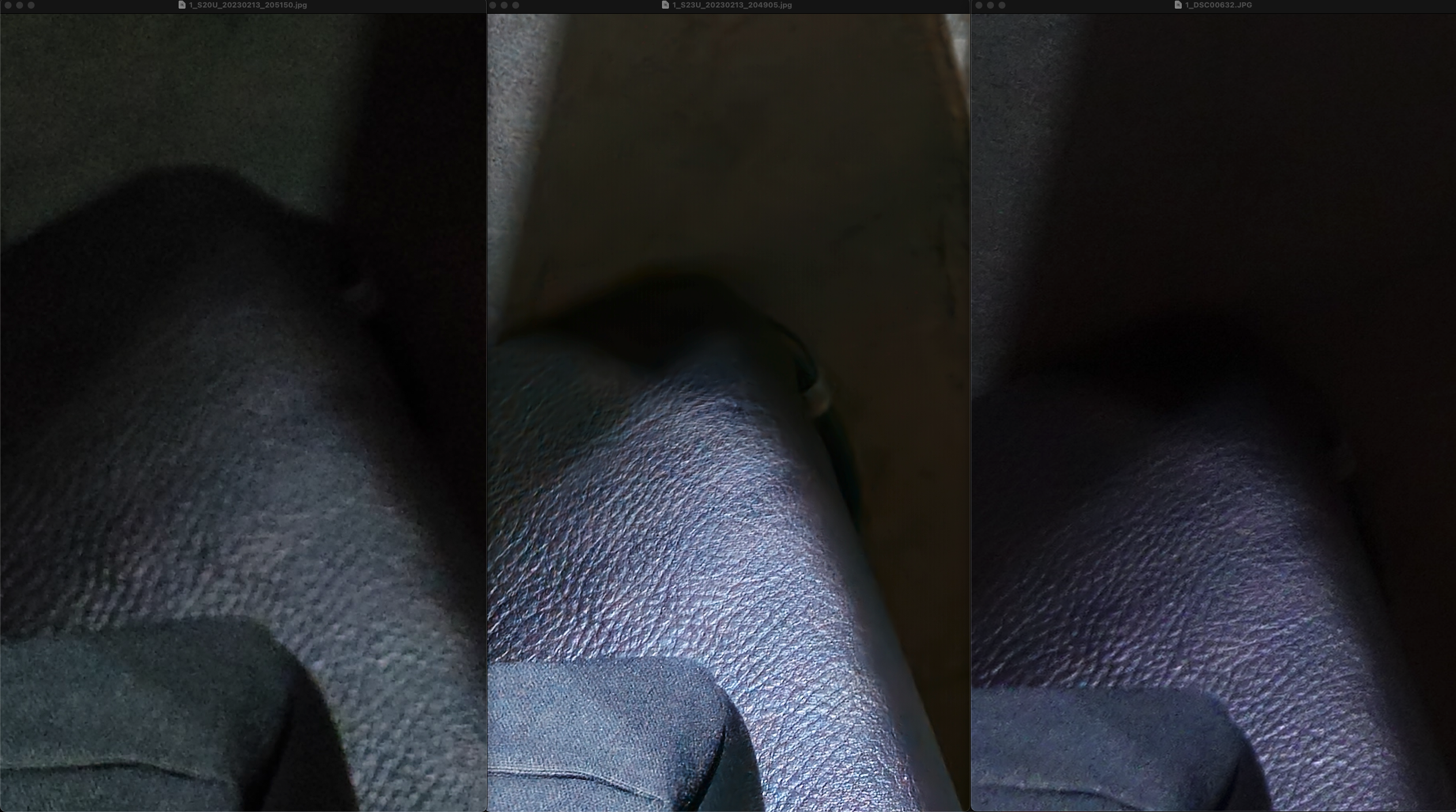 S20U 굉장히 흐릿하고 뭉개짐 / S23U 굉장히 선명 / RX100 가죽 무늬는 볼만함, 가방은 조금 뭉개짐