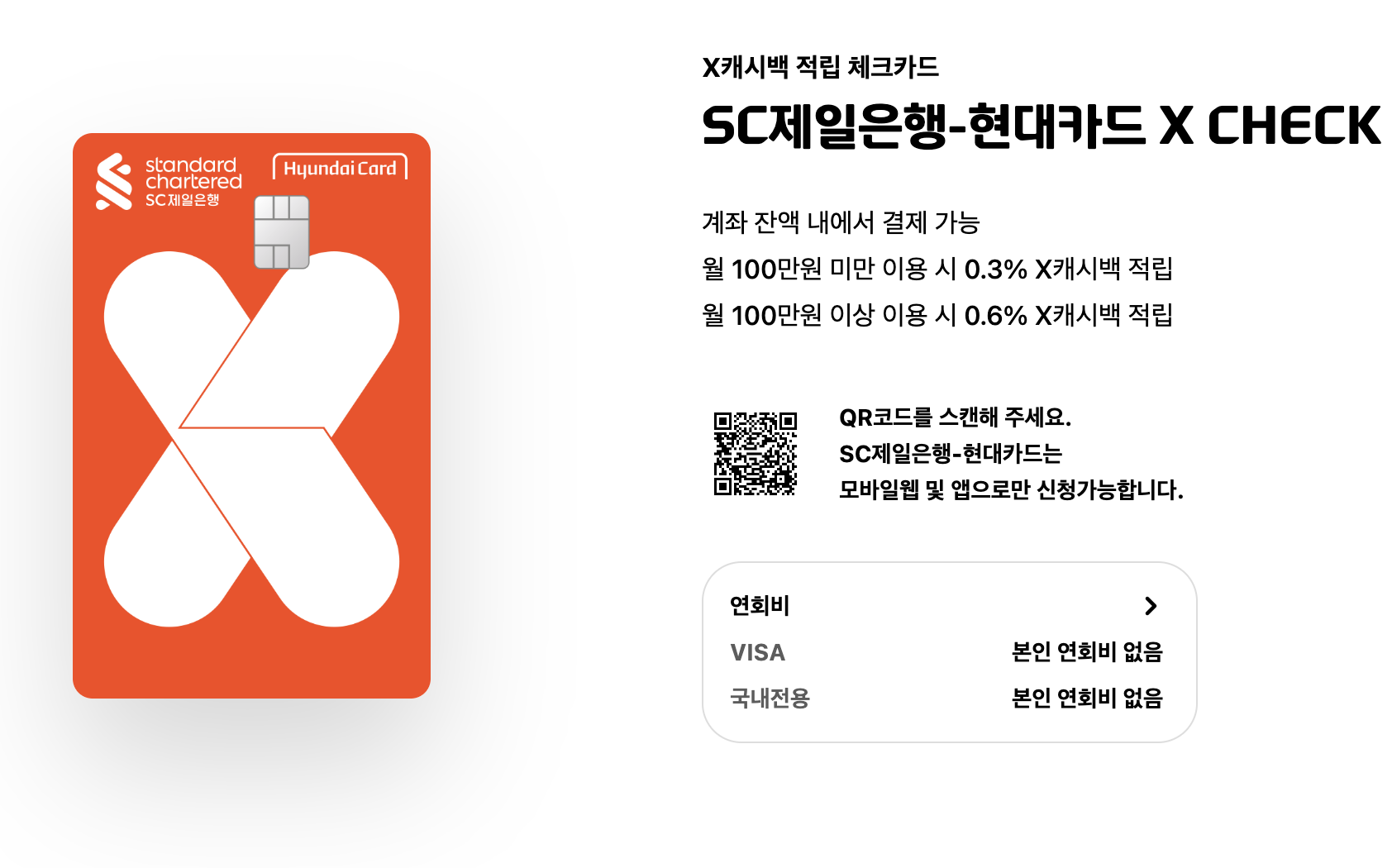 230413 추가) ![]() "SC제일은행-현대카드 X CHECK" / "SC제일은행-현대카드 M CHECK" 이거는 위에 보듯 "본인 연회비 없음" 입니다. |