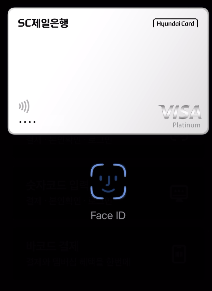 그래서 측면 버튼을 두 번 누르면 위와 같이 기본 카드가 뜨면서 얼굴인식 모드가 됩니다.