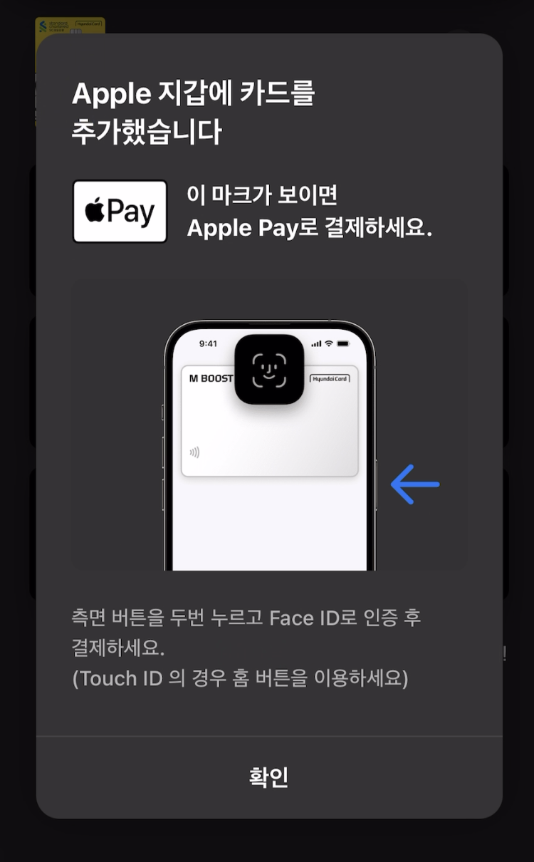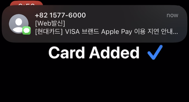 월렛 앱에 카드 추가와 함께, 현대카드의 확인 문자가 오고,