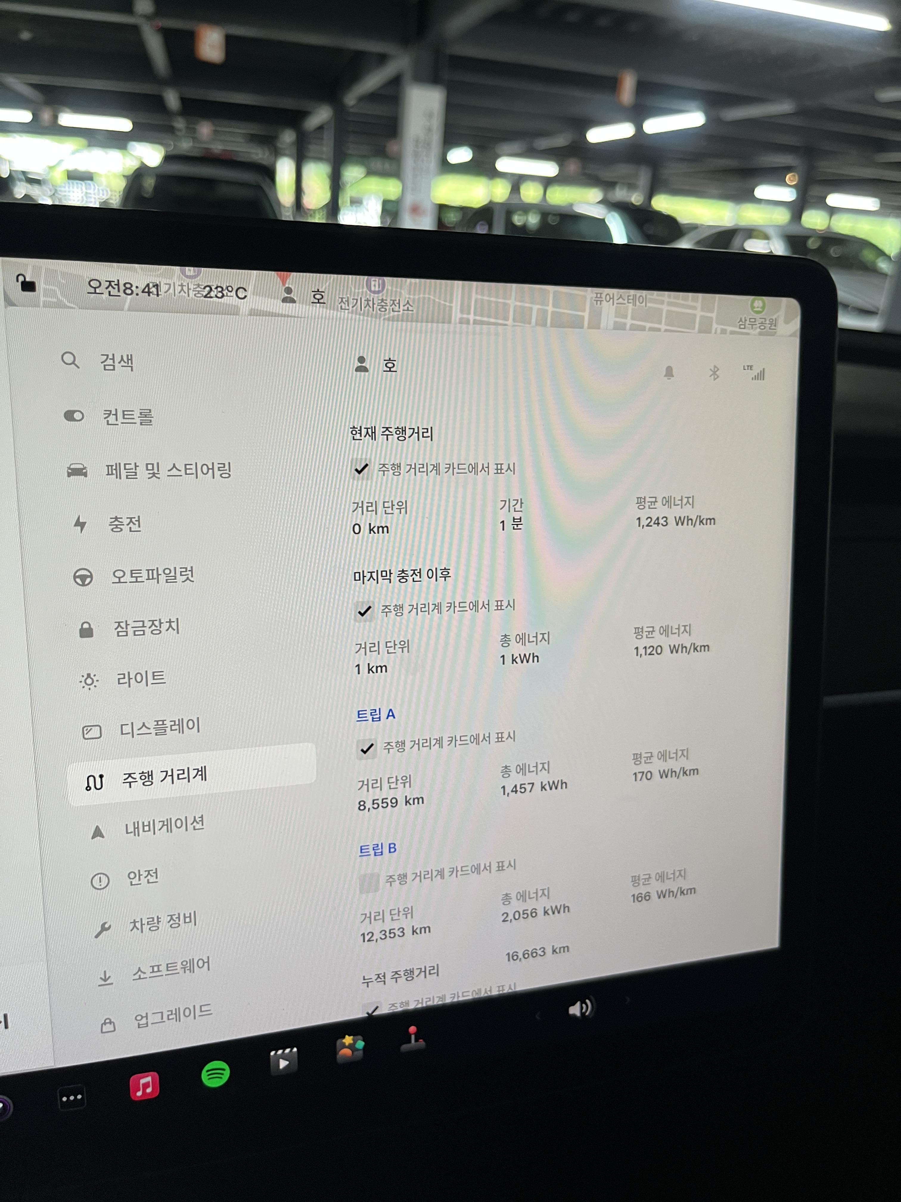 [8/31 10:05 배터리 77%, 주행 가능 거리 390km, 누적 주행거리 16686km] [트립상 23km주행, 9kWh 사용, 407Wh/km]