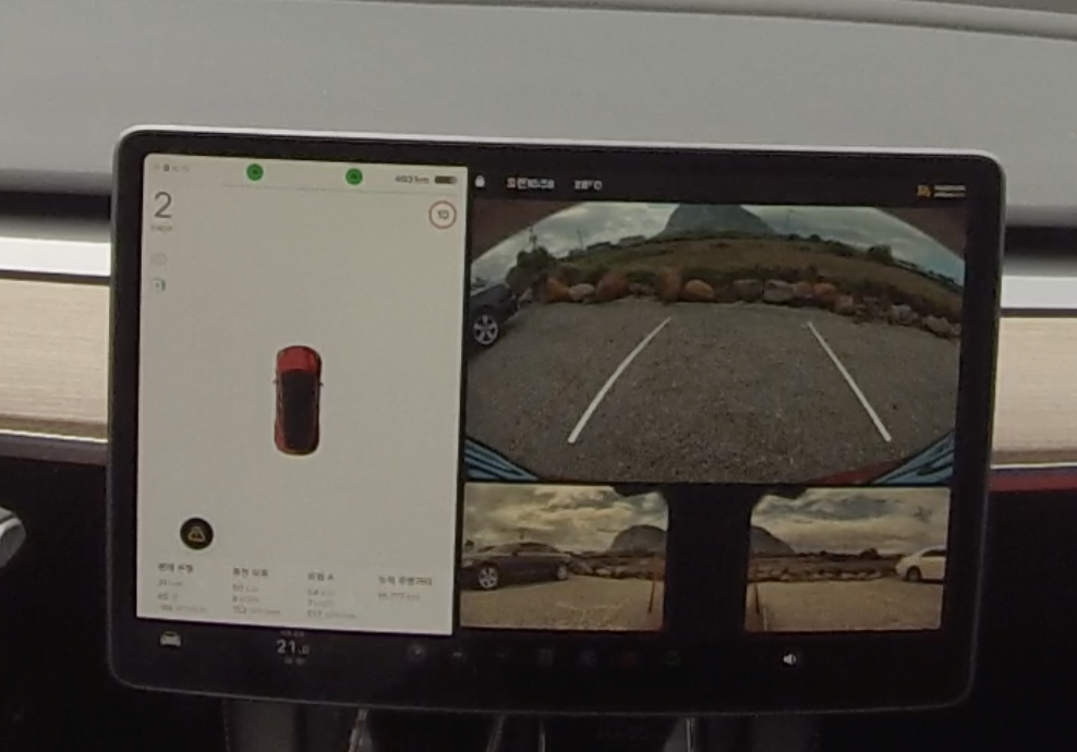카메라는 후방도 있고 측면도 당연히 있어서, 후진 기어를 넣으면 이렇게 측면도 잘 보여줍니다.