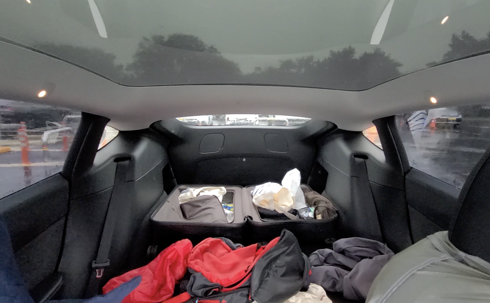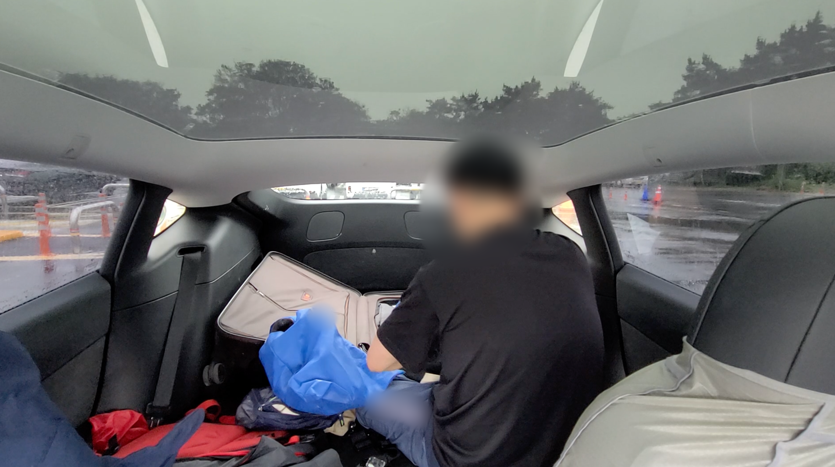 차 안에서 캠핑모드 켜놓고 젖은 옷 널어놓고 캐리어 정리하는 모습입니다. ㅋㅋㅋㅋㅋ