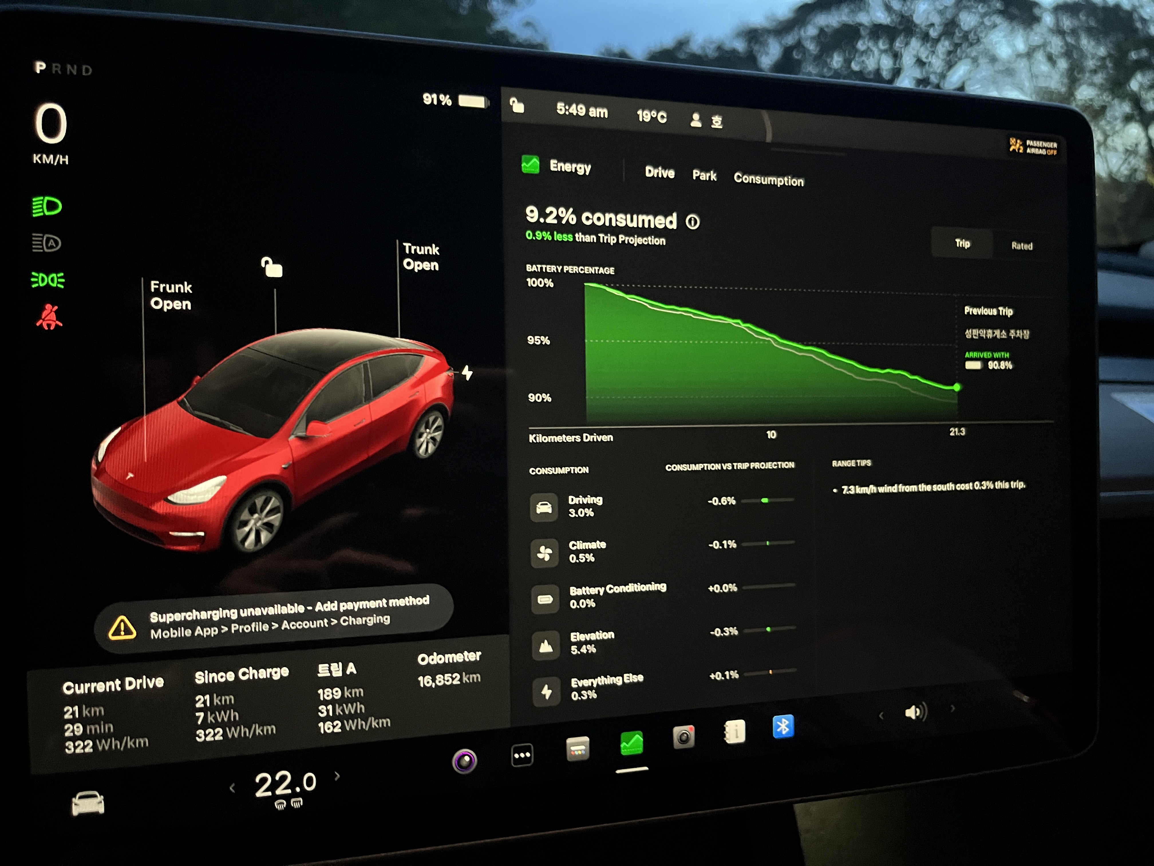 새벽 주행, 21km 주행했는데 테슬라가 예상한 배터리보다 0.9% 적게 써서 도착했다고 하네요.