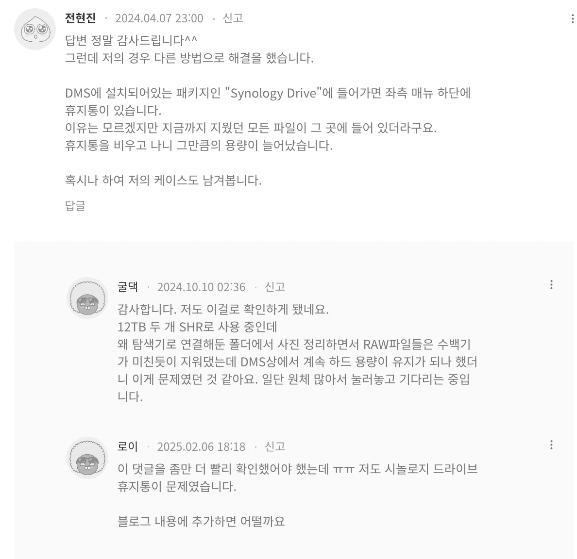 시놀로지 공식 게시글이나 구글링을 해봤는데 한 글 수십개는 봤을거에요.