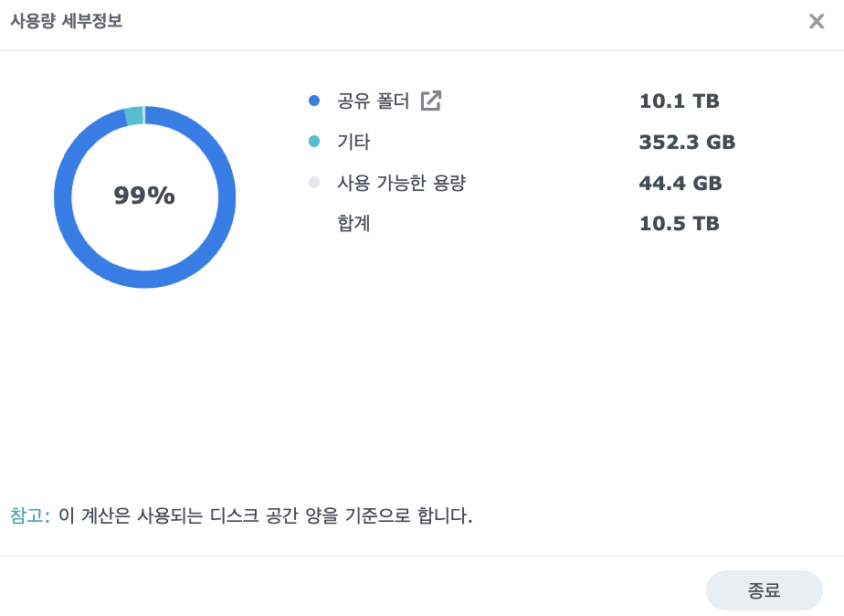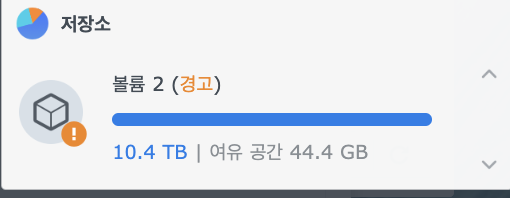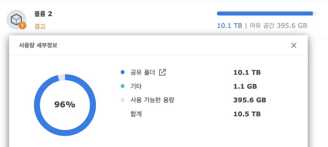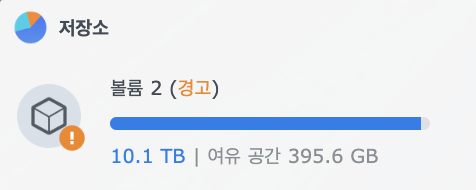 DSM 위젯에서 본 값도 사용량이 10.1TB로 0.3TB 줄었고, 여유공간이 44.4GB에서 약 0.3TB 늘어난 395.6GB로 표시됩니다.