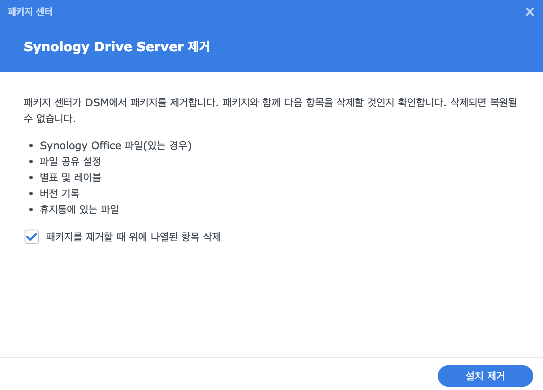 - DSM에서 시놀로지 드라이브 앱을 지웠습니다. 관련된 데이터들이 삭제된다고 해서 겁났지만 진행했고 용량이 늘어날걸 기대했으나 그대로였습니다.